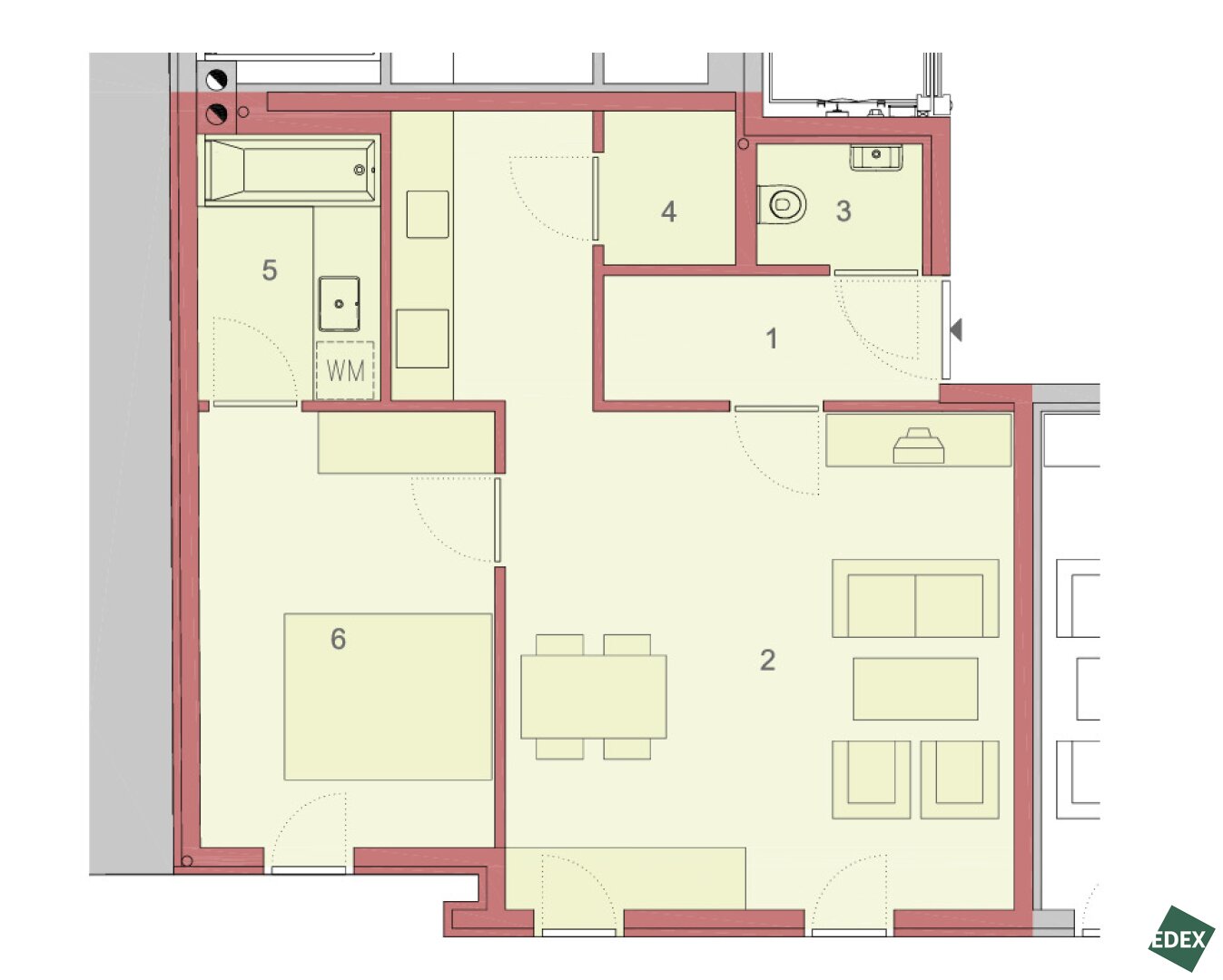 Die Wohnung verfügt über ein Wohnzimmer mit ausgestatteter Küche und ein Schlafzimmer das vom Wohnzimmer aus erreichbar ist und direkten Zugang zum Badezimmer hat, welches mit Badewanne und Doppelwaschbecken, Handtuchheizkörper und Waschmaschinen-Anschluss ausgestattet ist. Ein separater Abstellraum bietet zusätzlichen, praktischen Stauraum. Das WC ist separat ausgeführt, vom Vorraum begehbar und mit Handwaschbecken ausgestattet.