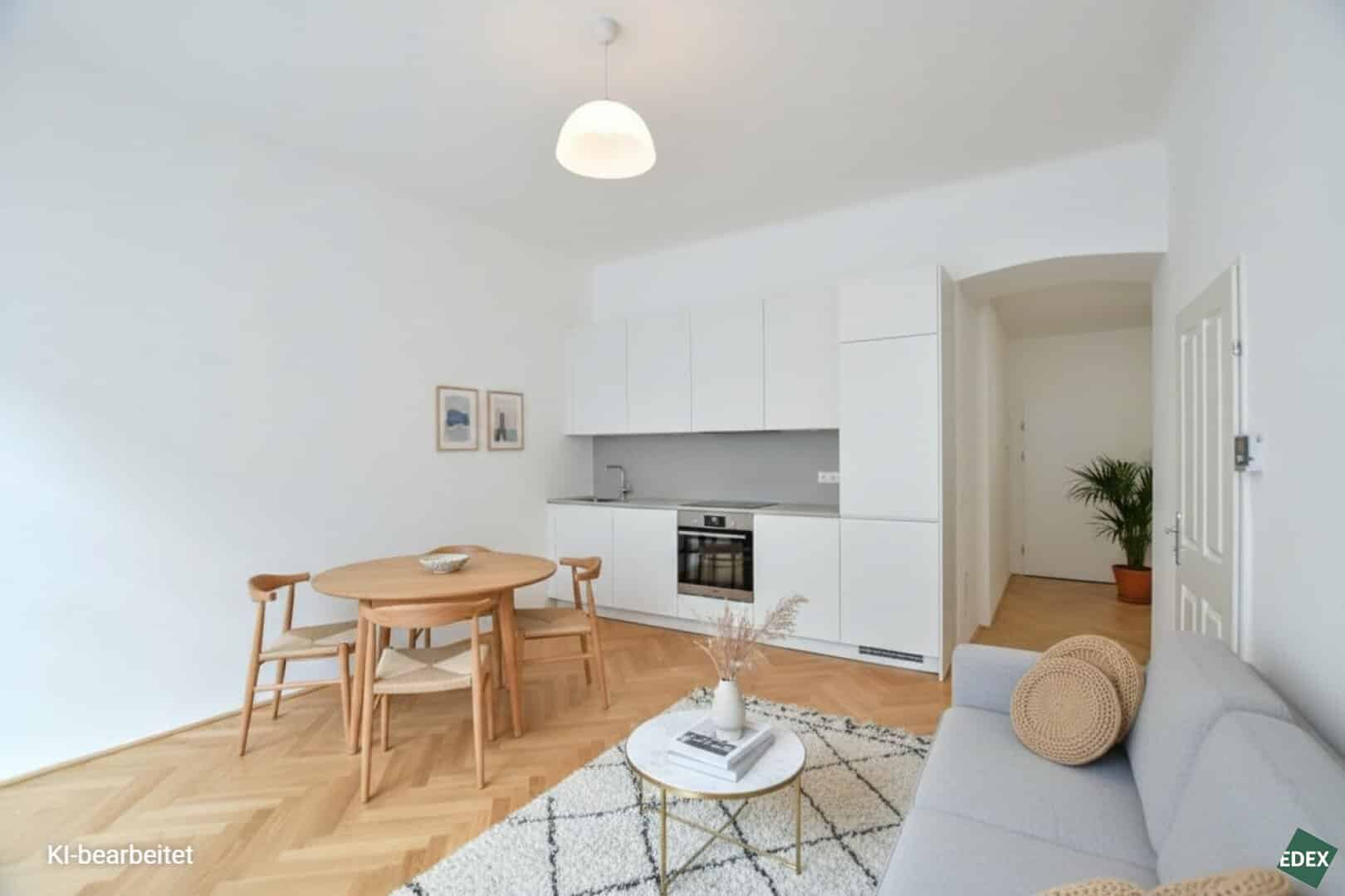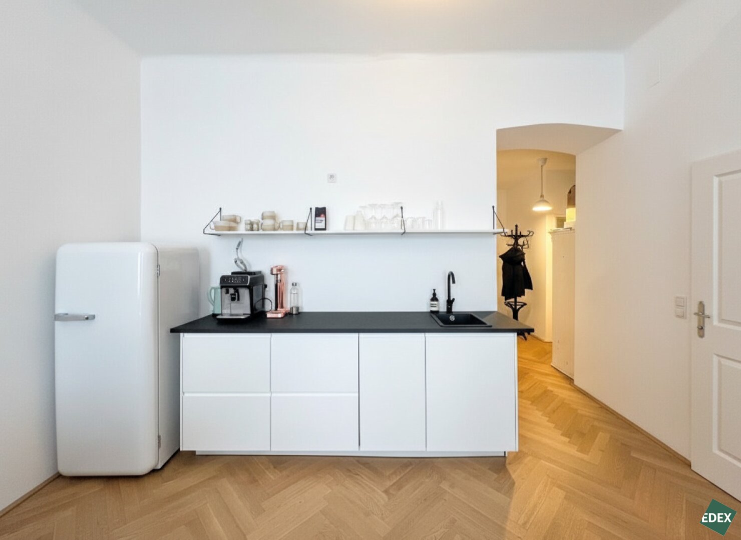 In der Wohnung ist derzeit eine Küche vorhanden, bestehend aus einer Einbauküche inklusive frei stehendem Kühlschrank, Waschbecken und Geschirrspüler. Ein Backrohr ist nicht vorhanden. Die Übernahme der Küche gegen Ablöse kann – sofern gewünscht – in Rücksprache mit dem derzeitigen Mieter erfolgen.