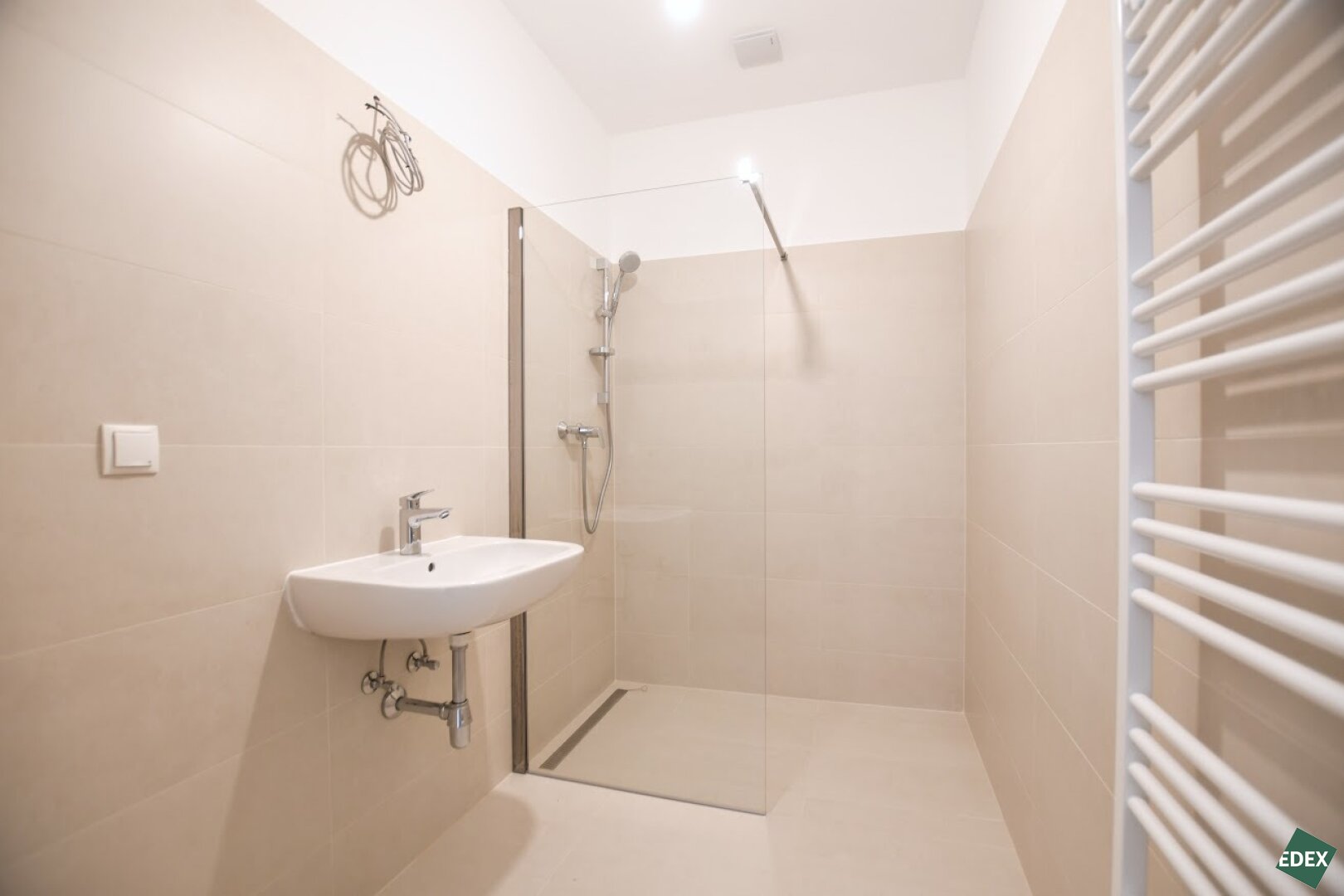 Badezimmer mit Dusche, Waschbecken und Waschmaschinen-Anschluss