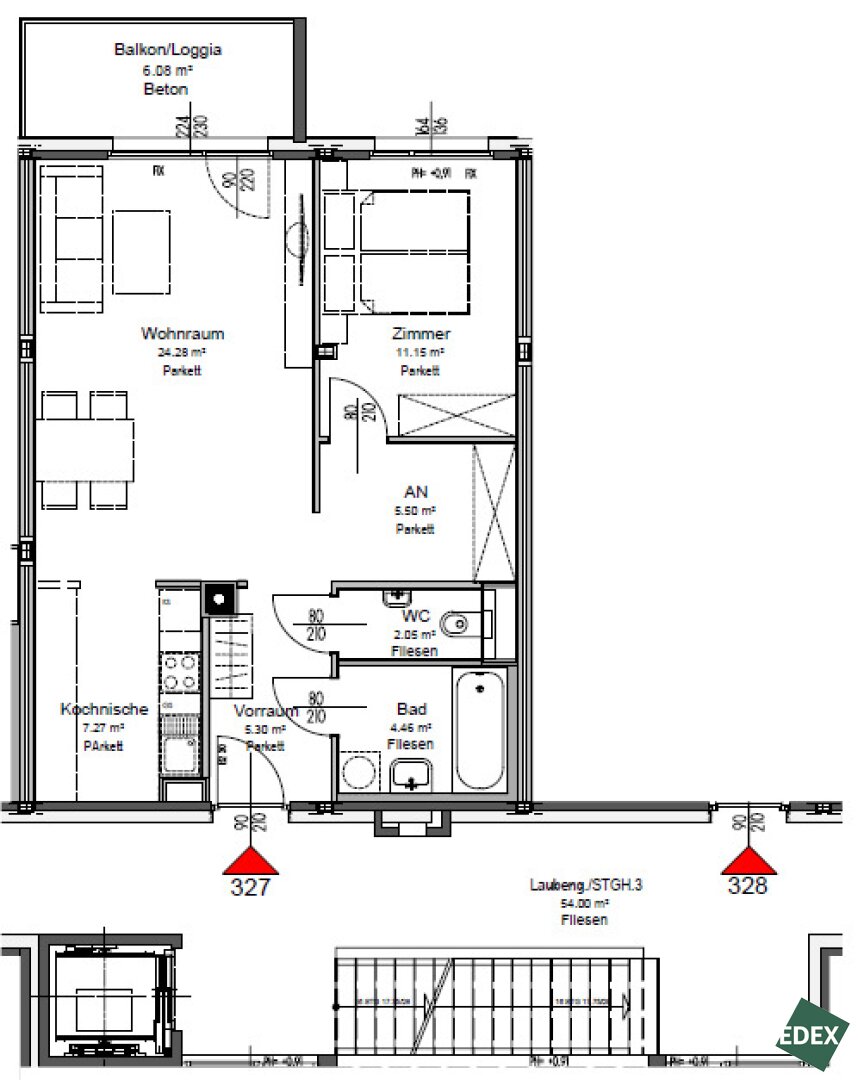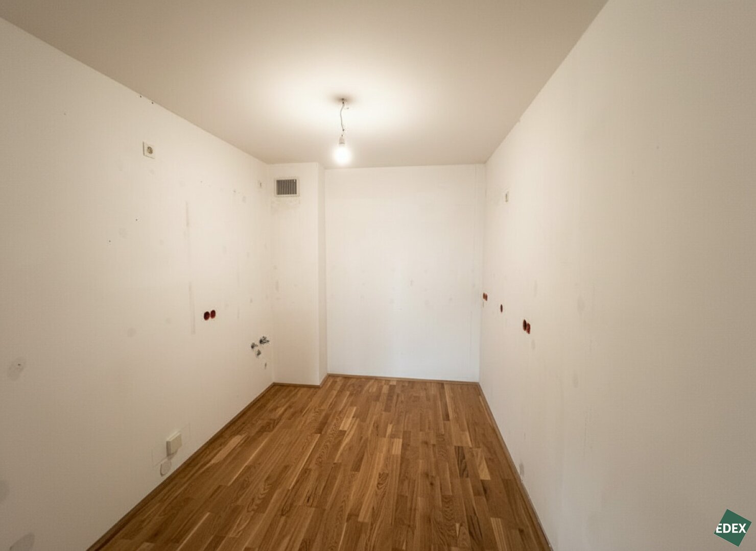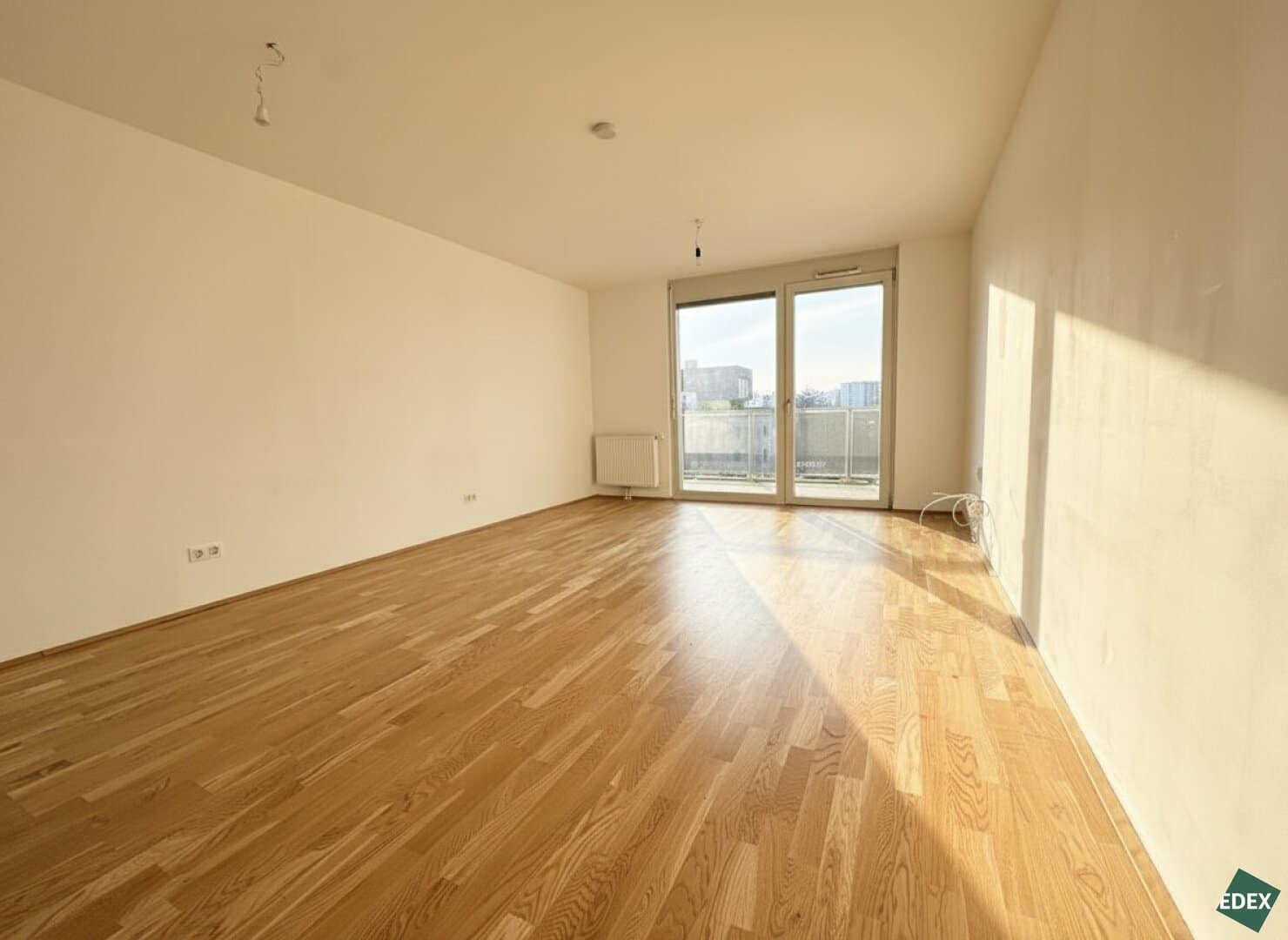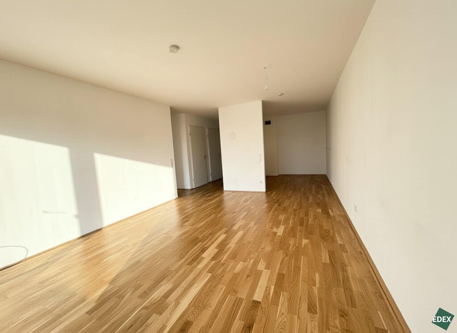 Der großzügige Wohnbereich mit offener Kochnische bildet das Herzstück der Wohnung und schafft ein helles und freundliches Ambiente. Von hier aus gelangt man direkt auf die Balkon/Loggia, die zusätzlichen Freiraum im Außenbereich bietet und zum Entspannen einlädt.