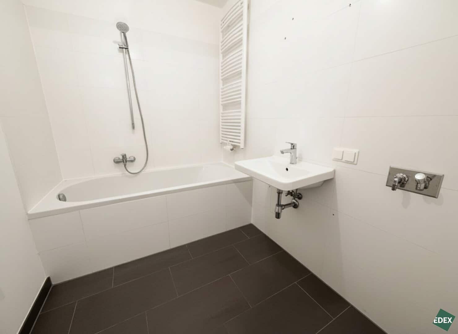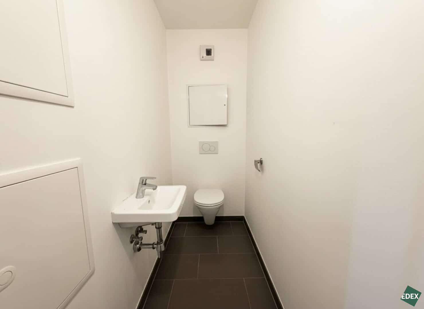 Beim Betreten der Wohnung gelangt man in den Vorraum, von dem aus das separate WC, das Badezimmer mit Badewanne, Waschbecken und Waschmaschinenanschluss sowie ein praktischer Abstellraum erreichbar sind, der zusätzlichen Stauraum bietet.