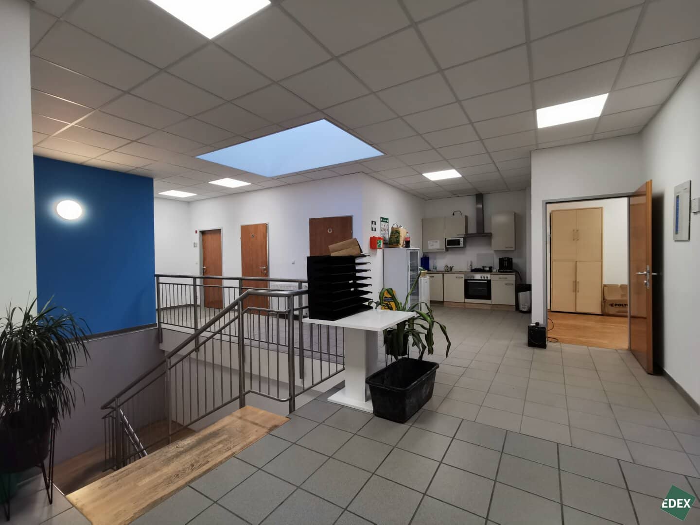 Das Objekt erstreckt sich über zwei Etagen und besitzt einen effizienten und flexibel gestaltbaren Grundriss. Im ersten und zweiten Obergeschoß befinden sich Büroflächen, ein Empfangsbereich, Sanitäranlagen, Besprechungszimmer, sowie Serverräume und Küchen. Im EG stehen großzügige Lagermöglichkeiten zur Verfügung, die mit über ein großes separates Tor inkl. Hebebühne begangen werden können.