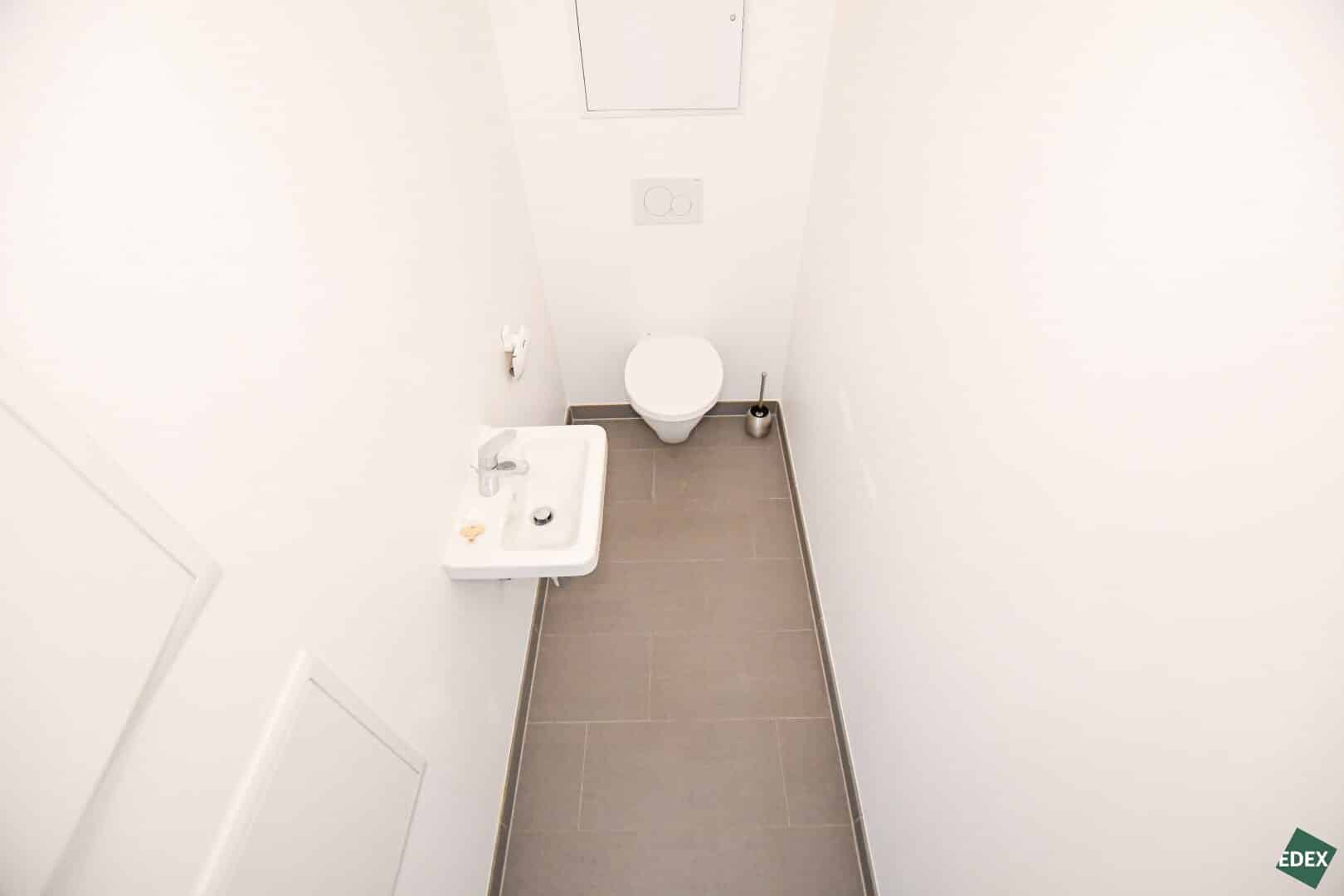 Beim Betreten gelangt man in den Vorraum, von dem aus sowohl das separate WC als auch das Badezimmer mit Badewanne, Waschbecken und Waschmaschinenanschluss erreichbar sind.