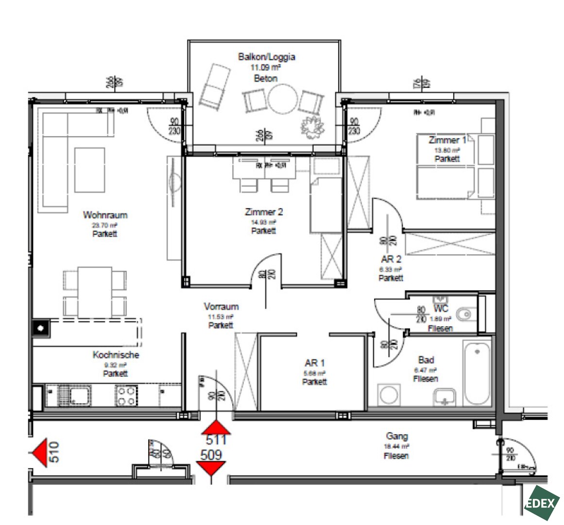 Vom Wohnraum sowie vom zweiten Zimmer aus besteht direkter Zugang zur großzügigen Loggia / zum Balkon mit ca. 11,09 m², der zusätzlichen Freiraum im Außenbereich bietet.