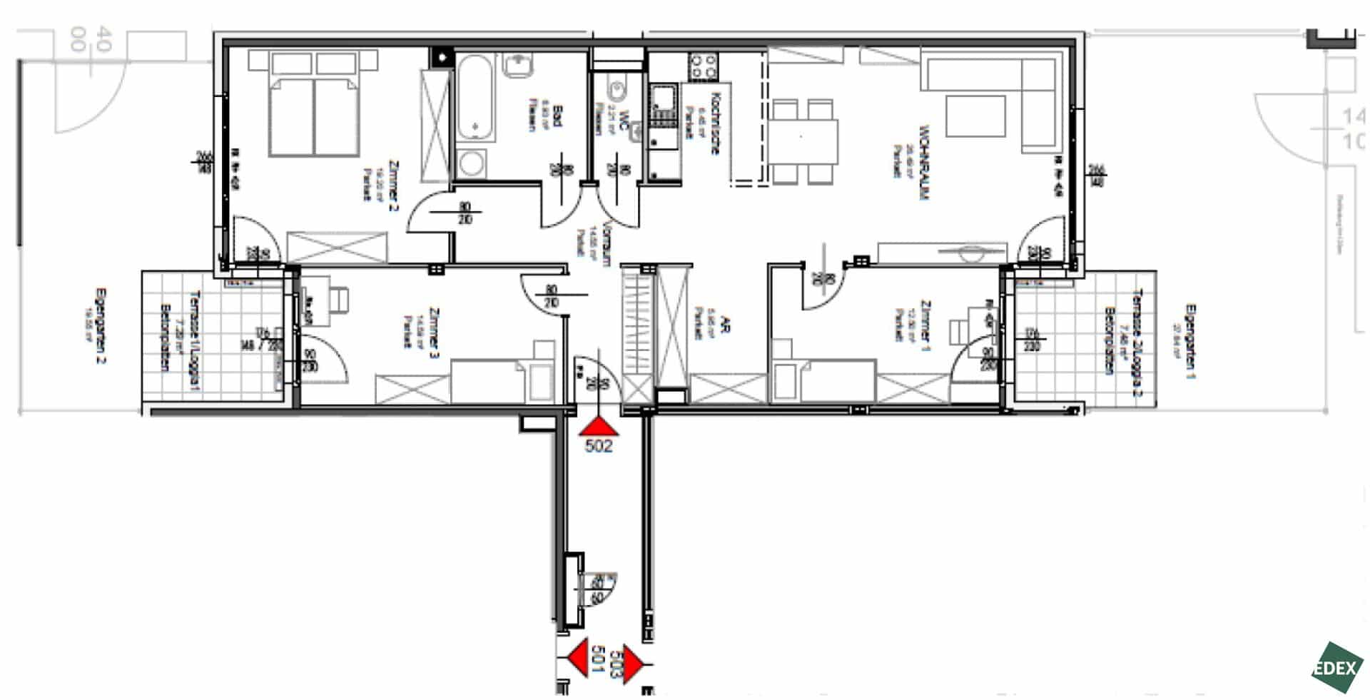 Vom Wohnbereich aus gelangt man direkt auf die Terrasse/Loggia mit ca. 11,52 m², die in den Eigengarten mit rund 32,05 m² übergeht – ein großzügiger Außenbereich, der zum Entspannen und Verweilen im Freien einlädt.
