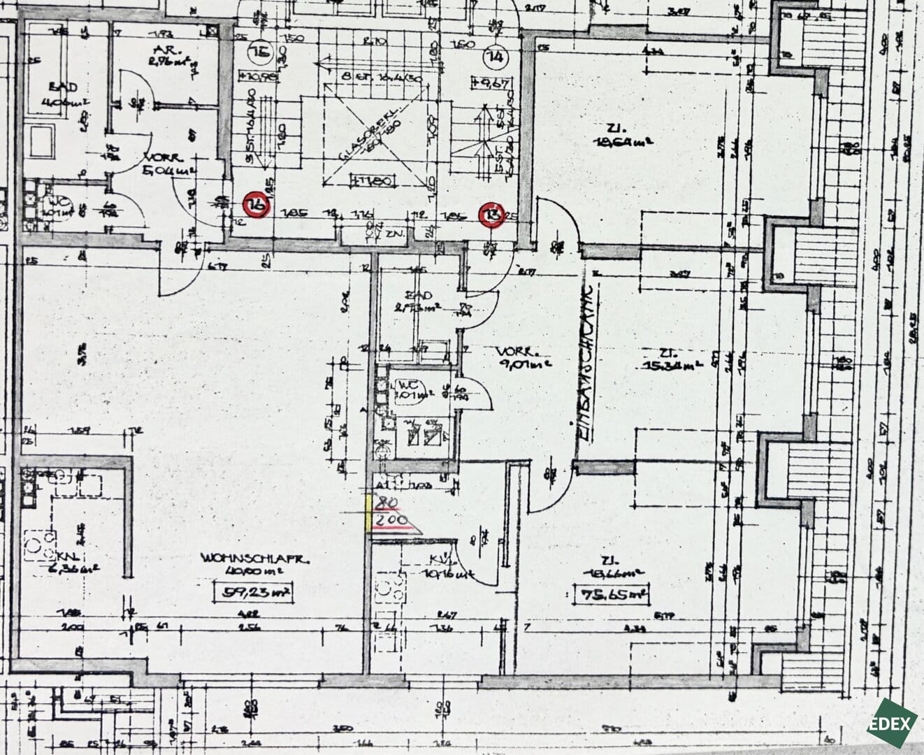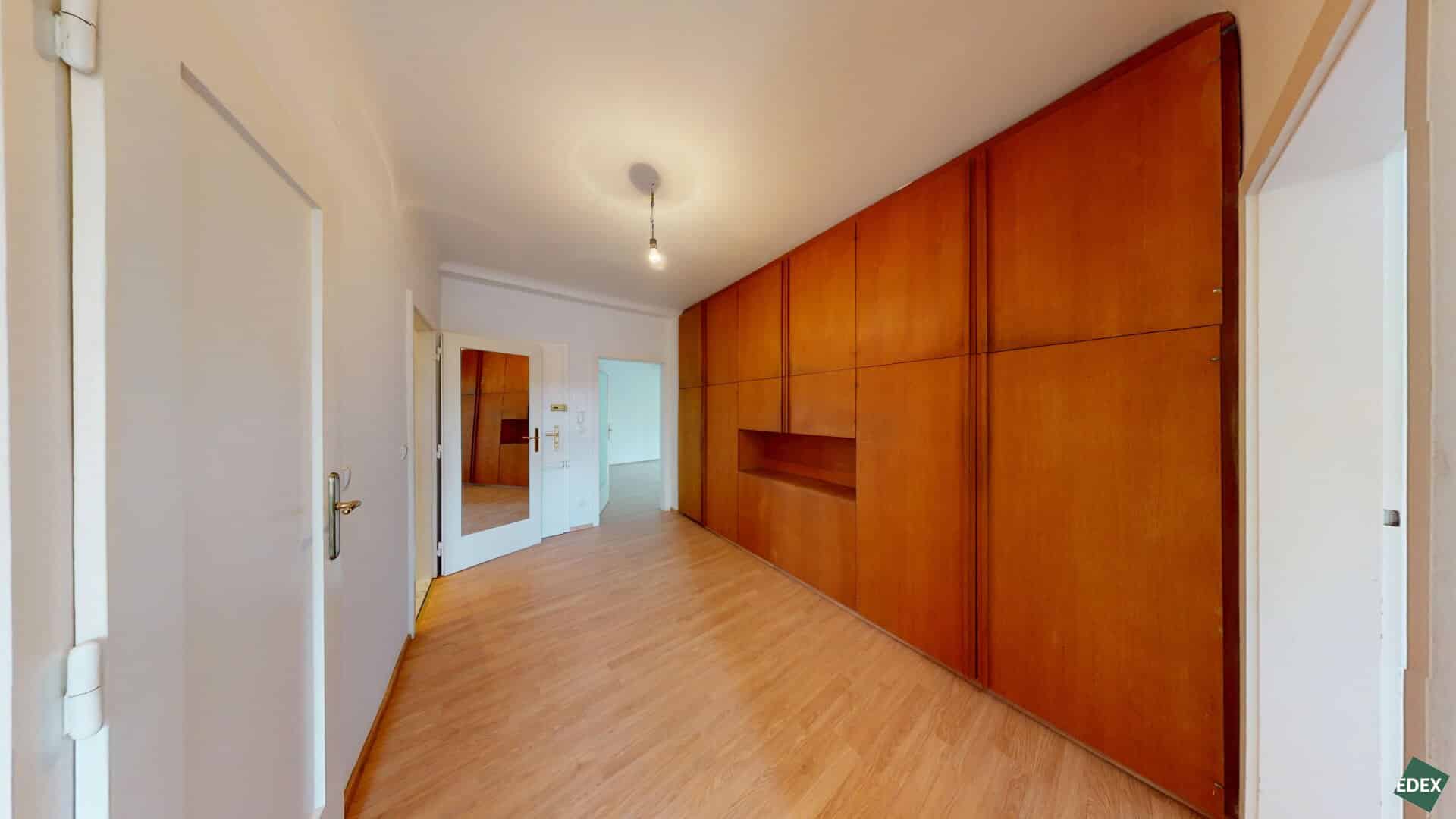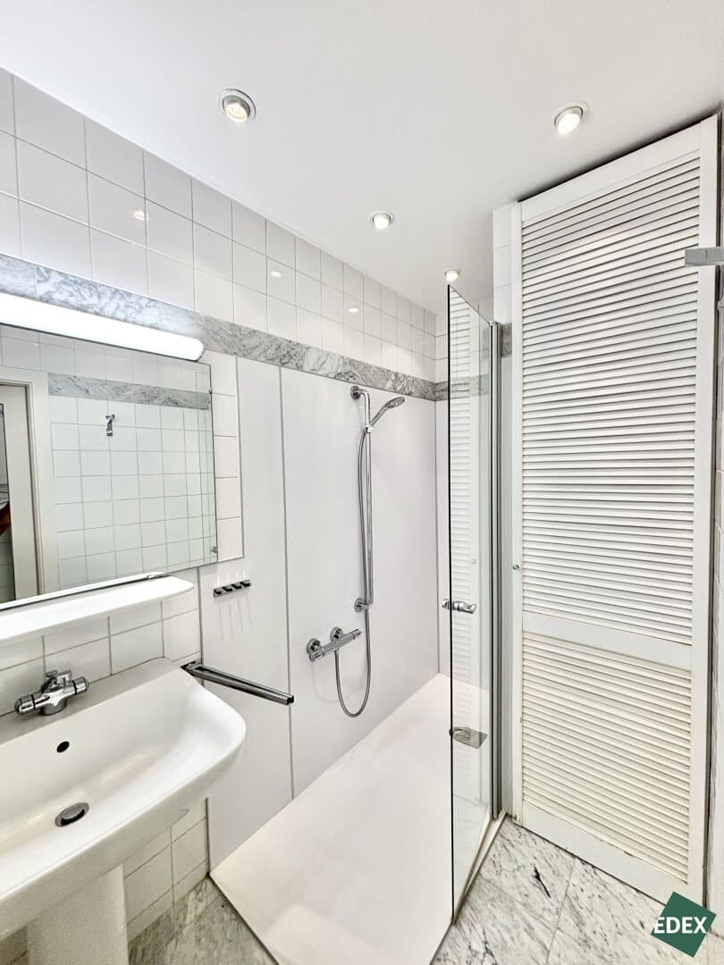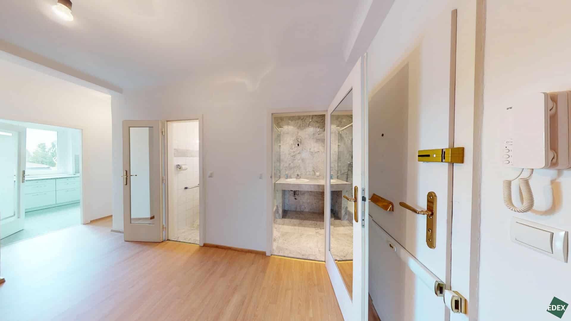Der zentrale Vorraum erschließt drei helle Zimmer mit Grünblick, ein Badezimmer mit Dusche und Waschbecken, ein separates WC sowie die Küche. Eine Besonderheit ist der von Architekt Gustav Peichl entworfene Einbauschrank, der den Vorraum gestalterisch gliedert. Über einen Verbindungsgang gelangt man in das rund 40 m² große Wohnzimmer mit Anschlüssen für eine mögliche Wohnküche. Auch hier findet sich ein maßgefertigtes Wandregal – ebenfalls von Peichl designt. Ein zweites Badezimmer mit bodengleicher Walk-in-Dusche, Waschbecken und Waschmaschinenanschluss, ein weiteres separates WC sowie ein praktischer Abstellraum runden das durchdachte Raumkonzept ab.