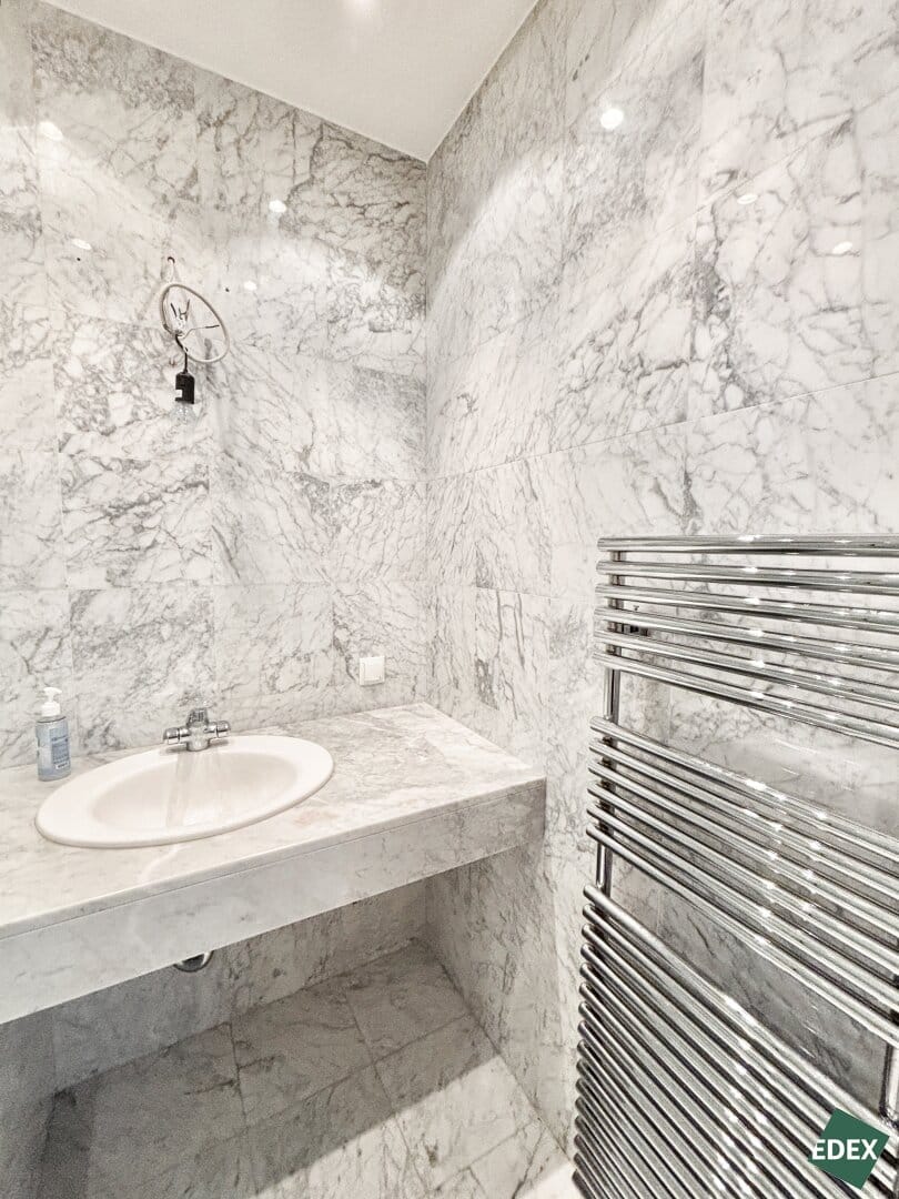 - 1 Badezimmer mit Dusche, Waschbecken und Handtuchheizkörper