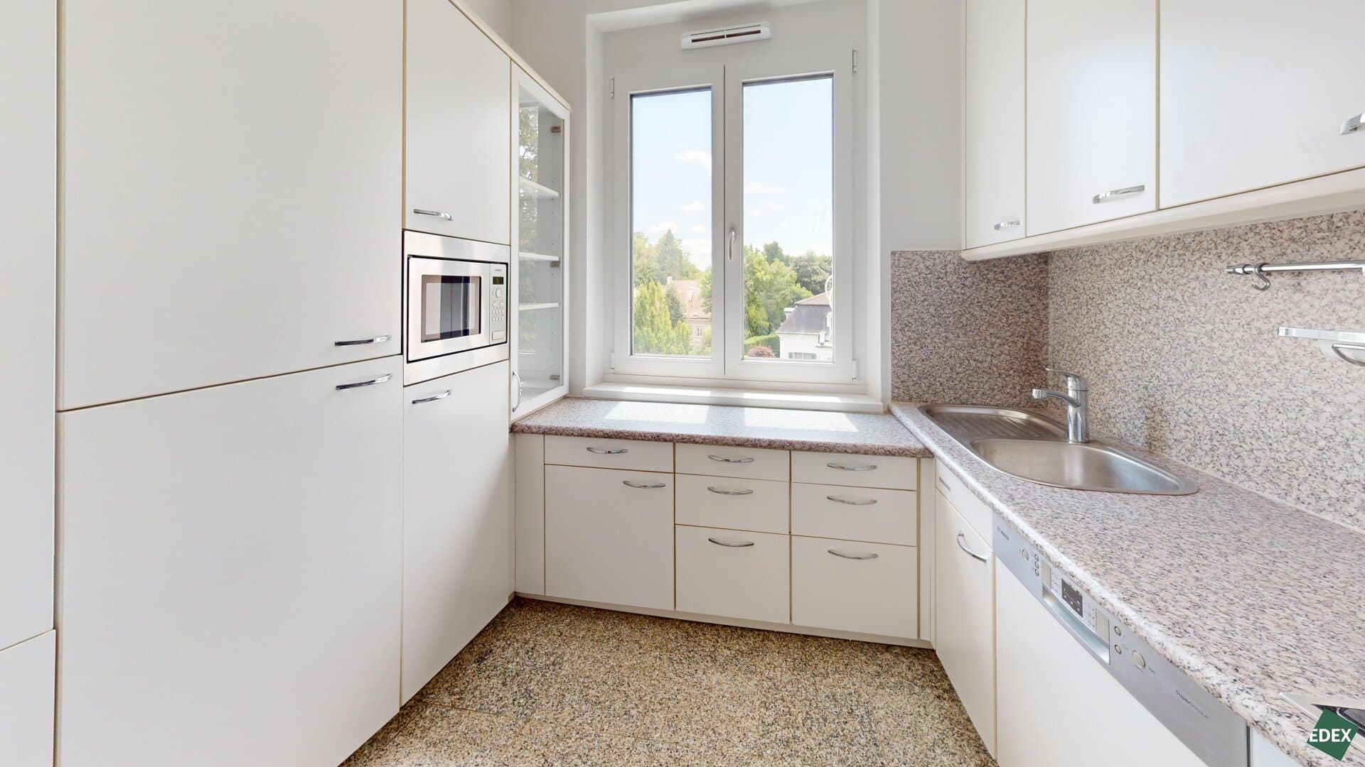 The central entrance hall leads to three bright rooms with a green view, a bathroom with shower and sink, a separate toilet, and the kitchen. A special feature is the built-in cupboard designed by Austrian architect Gustav Peichl, which divides the entrance hall. A connecting corridor leads to the approximately 40 m² living room with connections for a possible open kitchen. Here, too, there is a custom-made wall shelf – also designed by Peichl. A second bathroom with a floor-level walk-in shower, sink, and washing machine connection, another separate toilet, and a practical storage room round off the well-thought-out room concept.