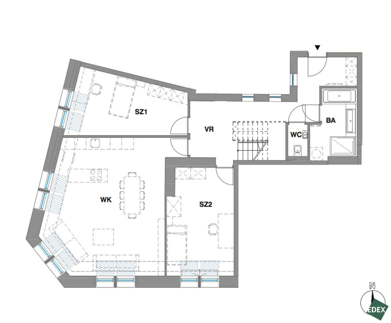 Diese Dachgeschosswohnung besitzt einen idealen Grundriss, erstreckt sich über zwei Ebenen und teilt sich wie folgt auf: