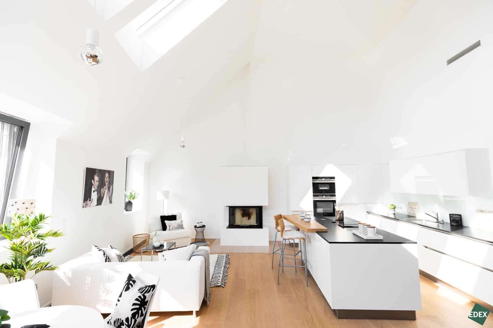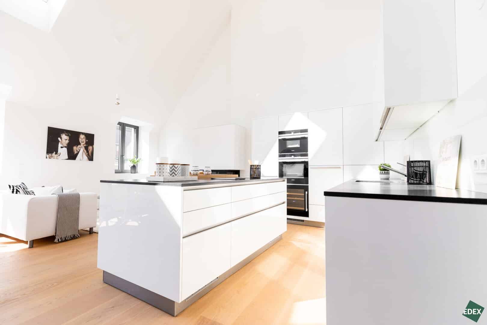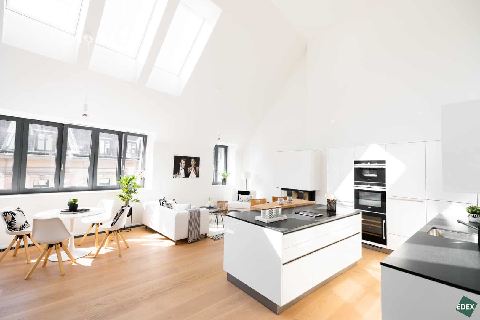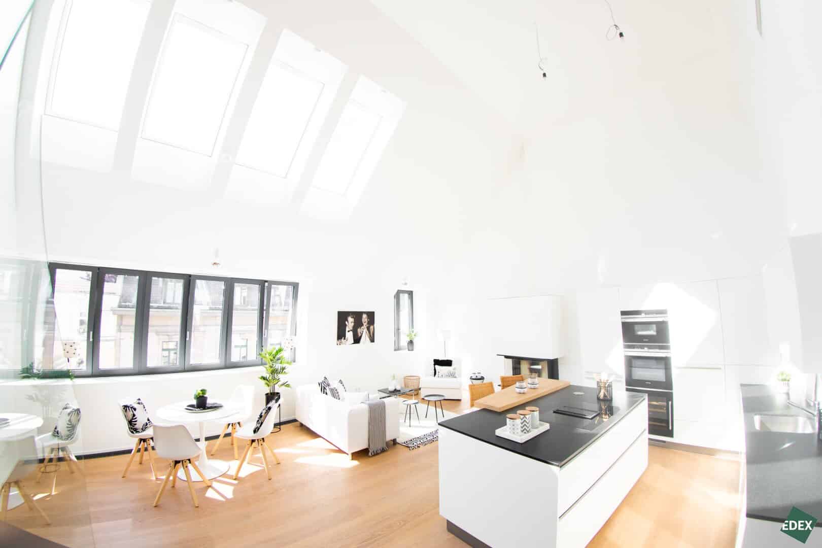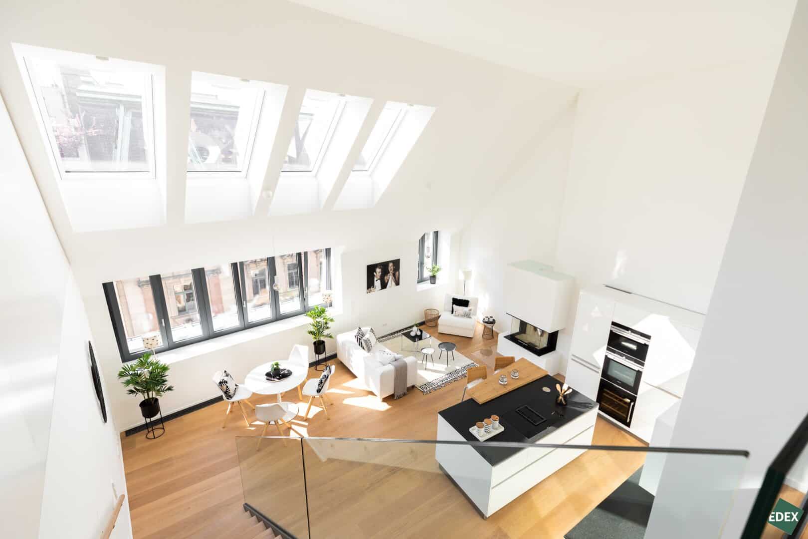 Auf rund 180 m² und zwei Etagen findet man eine Atmosphäre der absoluten Extraklasse. Die 4 Zimmer sind sehr großzügig angelegt und ermöglichen ein offenes und beindruckendes Wohnerlebnis. Die Wohnung verfügt über eine loftartige Wohnküche mit einer Raumhöhe von mehr als 5m. Das Galleriegeschoss verfügt über einen separaten Master-Bedroom. Ein Gästezimmer und ein Kinderzimmer befinden sich im Dachgeschoss.