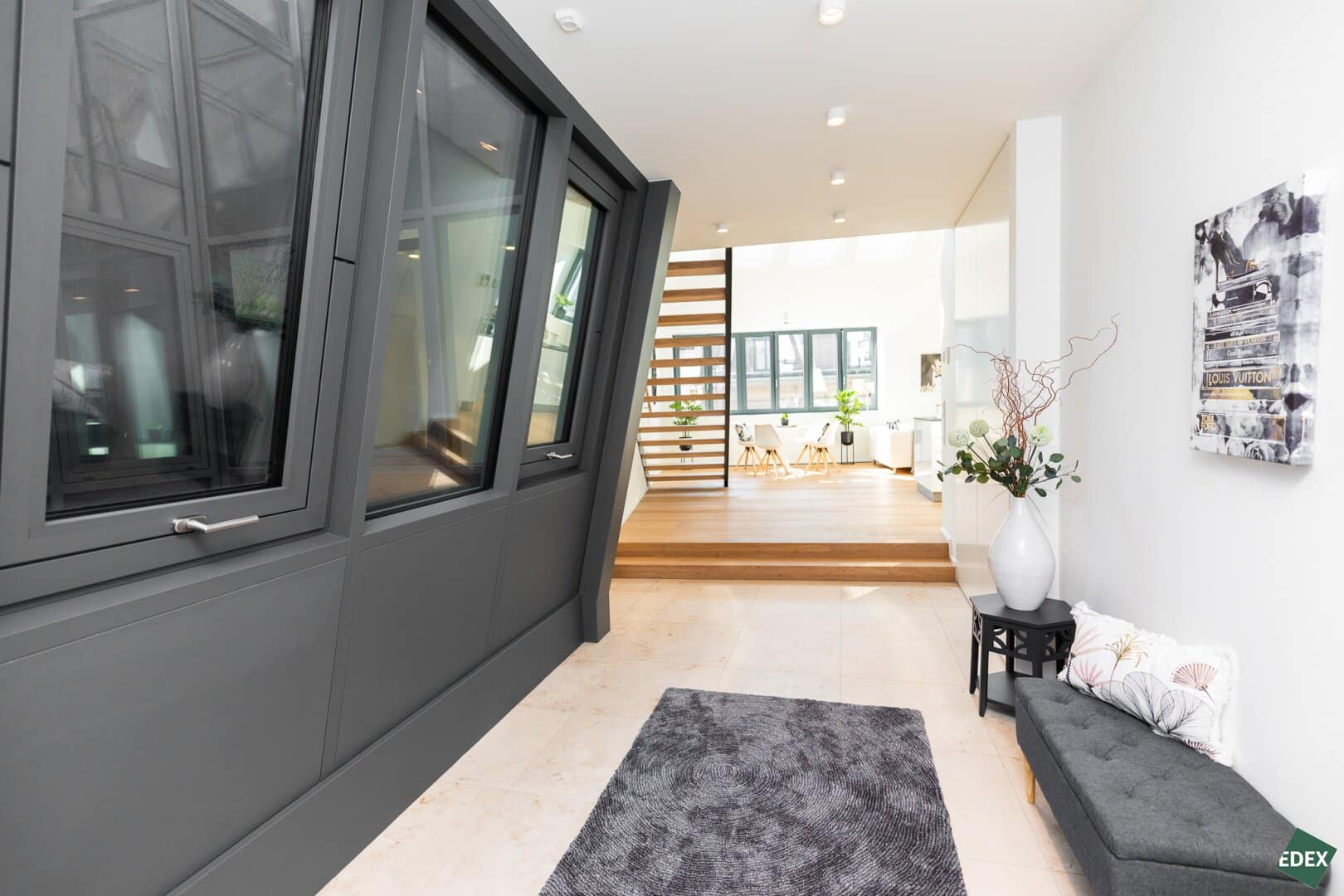 Covering ca. 180 m² and over two floors one finds this gorgeous apartment in a class of its own. The 4 rooms are very generously applied and enable an open and formidable living-experience. The flat includes a loft-like kitchen-cum-living room with the height of the room being more than 5 meters. The gallery floor covers a separate master bedroom. A guest room and a children’s room are located on the lower level.