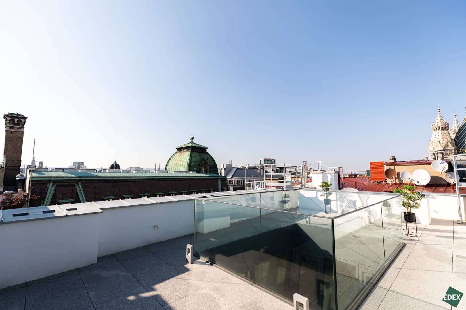 Absolutes Highlight der Wohnung ist die rd. 50 m² große Dachterrasse mit Blick über die Stadt und auf den Stephansdom. Durch den 360 Grad Blick erhält man ein beeindruckendes Stadtbild. Die Installation eines Jacuzzis ist möglich. Durch die Bauweise ist die Terrasse fast uneinsichtig und bietet ein hohes Maß an Privatsphäre und Exklusivität.