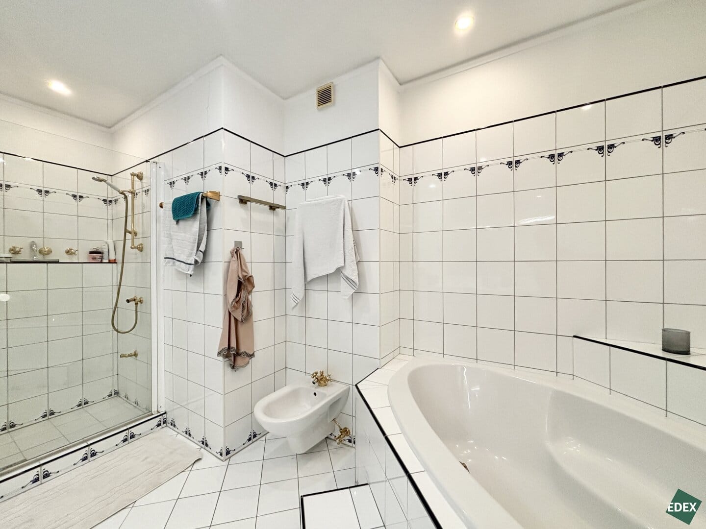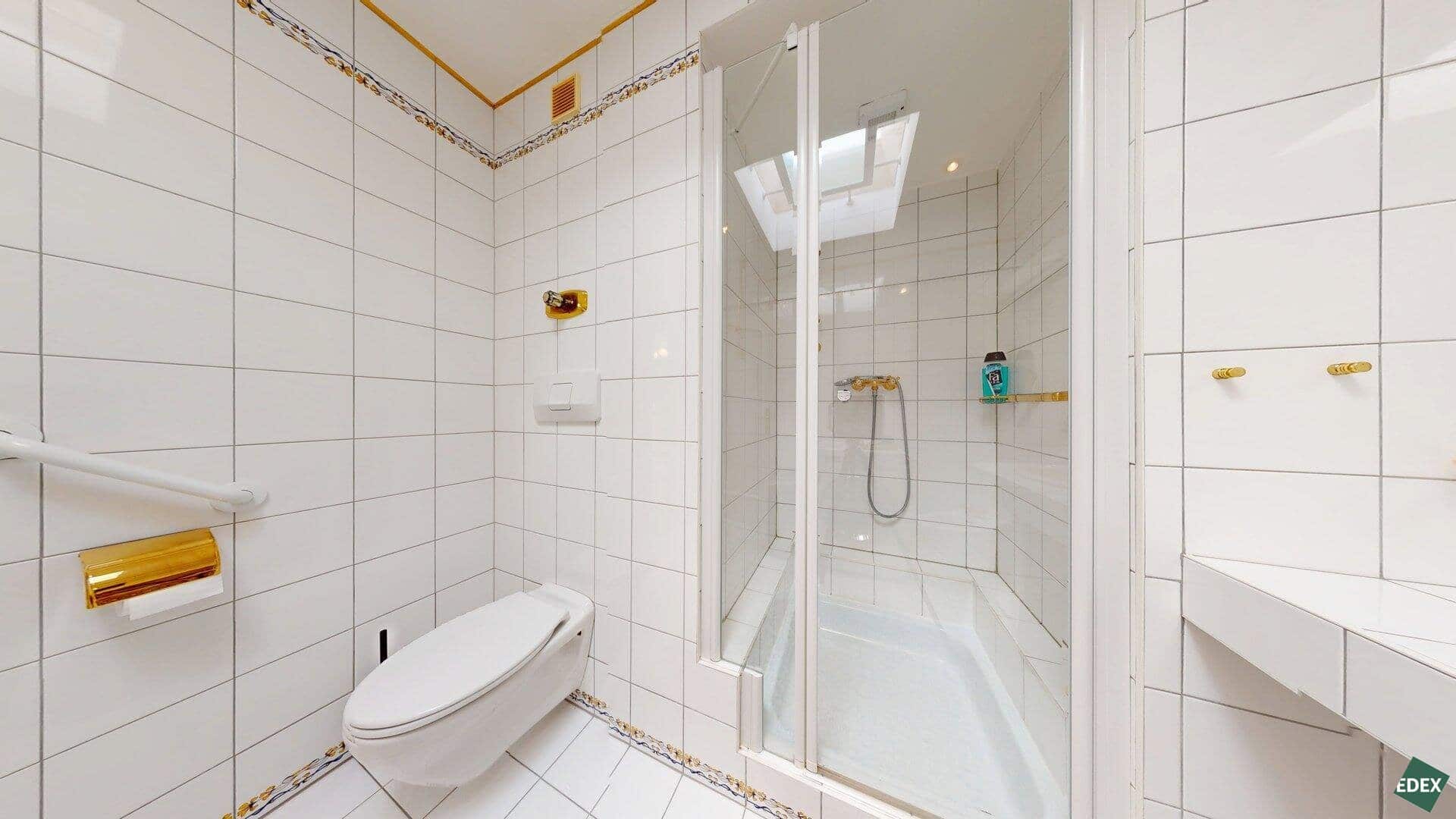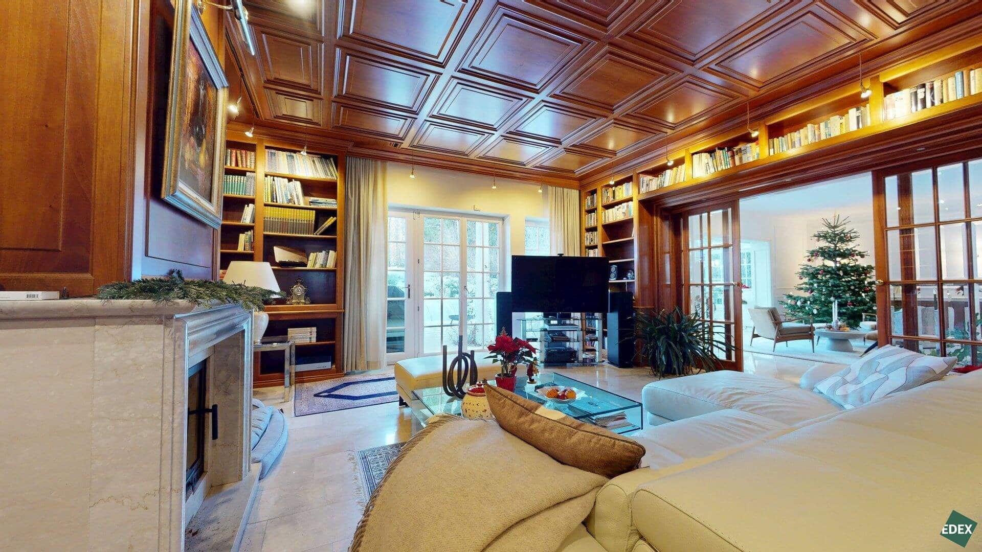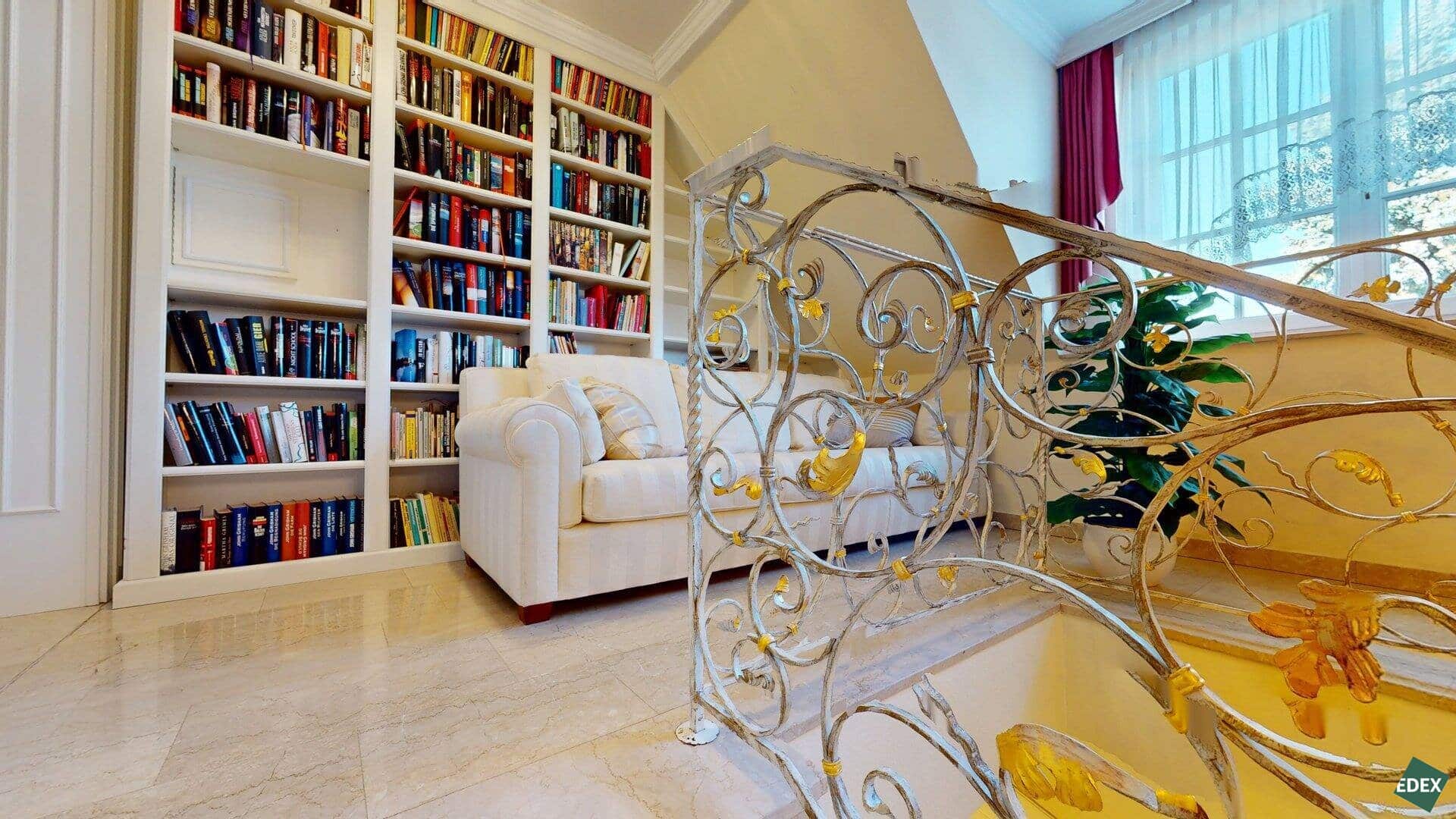 Angrenzend an den Wohnsalon befindet sich eine stilvolle Bibliothek mit exquisiter Holztäfelung und offenem Kamin – ein Raum für Ruhe, Inspiration oder repräsentatives Arbeiten.Ein weiteres Arbeitszimmer, das auch als Schlafzimmer genutzt werden kann, bietet flexible Wohnmöglichkeiten. Von hier führt ein Verbindungsgang zu einem separaten WC sowie einem Badezimmer mit Badewanne, Dusche und Bidet.