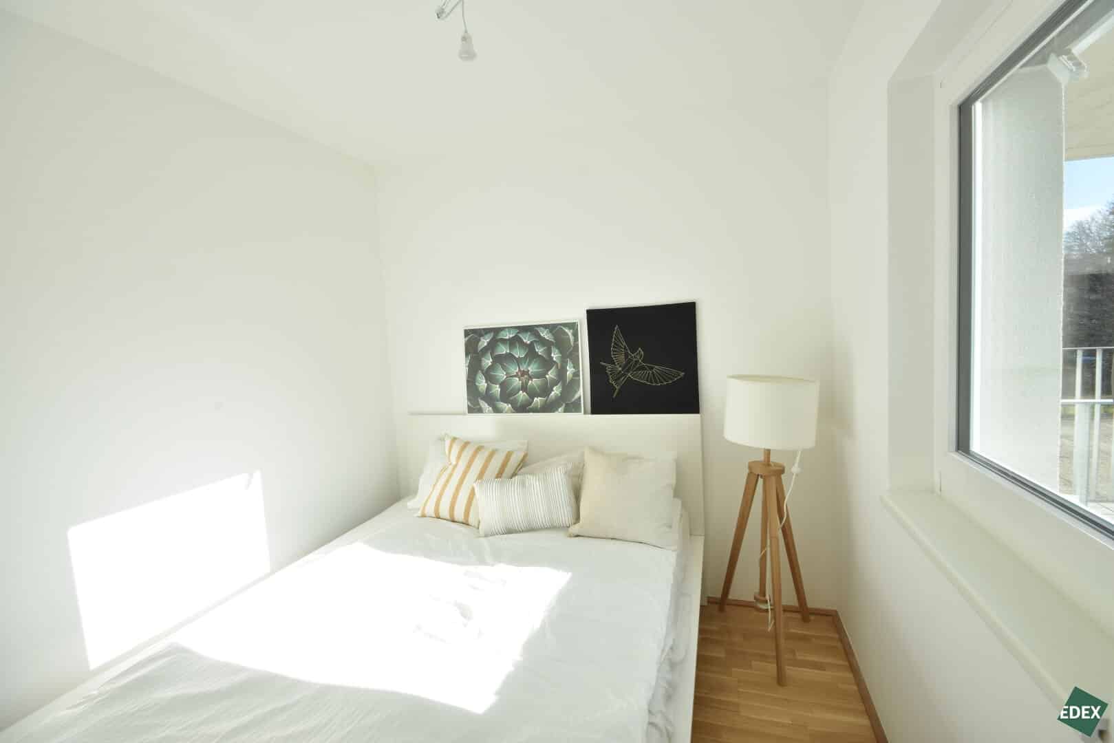 Alle 44 Eigentumswohnungen verfügen über äußerst effiziente Grundrisse sowie teilweise über Balkon, Terrasse oder Eigengarten, die Nutzflächen der Wohnungen liegen zwischen 32 m² und 91 m². Moderne, elegante Bäder und hochwertige Parkettböden schaffen eine zeitgemäße Wohnatmosphäre. Eine Wärmepumpe sowie eine Photovoltaik-Anlage mit einer Leistung von mindestens ca. 3,46 kWp sorgen für eine umweltschonende Energieversorgung. Durch Einsatz eines Smart-Home-Systems, können Haustüren über das Smartphone aufgesperrt oder Informationen zum Gebäude von unterwegs abgerufen werden. In der Garage stehen 21 Garagenplätze zur Verfügung, E-Ladestationen können nachgerüstet werden.