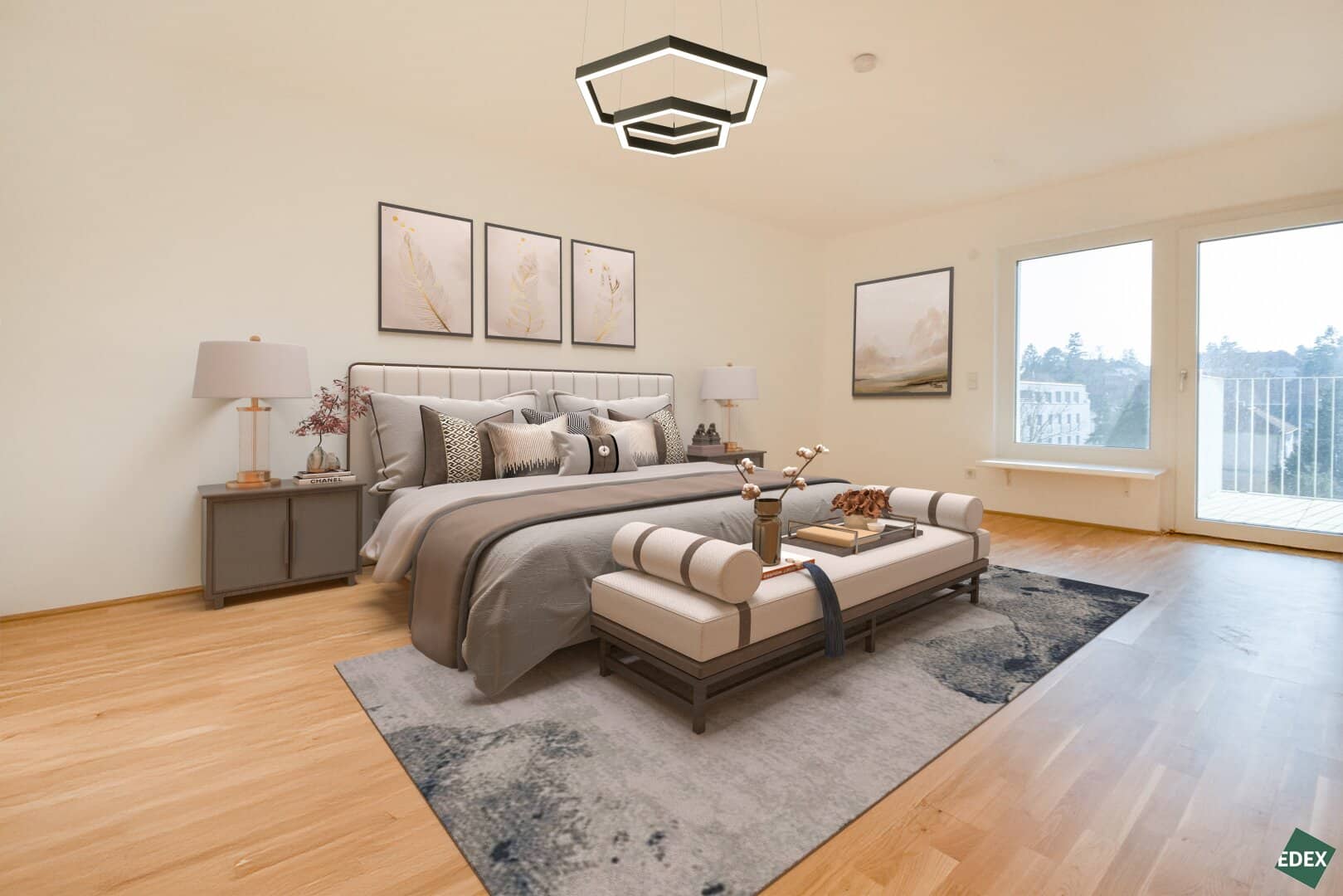 Alle 44 Eigentumswohnungen verfügen über äußerst effiziente Grundrisse sowie teilweise über Balkon, Terrasse oder Eigengarten, die Nutzflächen der Wohnungen liegen zwischen 32 m² und 91 m². Moderne, elegante Bäder und hochwertige Parkettböden schaffen eine zeitgemäße Wohnatmosphäre. Eine Wärmepumpe sowie eine Photovoltaik-Anlage mit einer Leistung von mindestens ca. 3,46 kWp sorgen für eine umweltschonende Energieversorgung. Durch Einsatz eines Smart-Home-Systems, können Haustüren über das Smartphone aufgesperrt oder Informationen zum Gebäude von unterwegs abgerufen werden. In der Garage stehen 21 Garagenplätze zur Verfügung, E-Ladestationen können nachgerüstet werden.