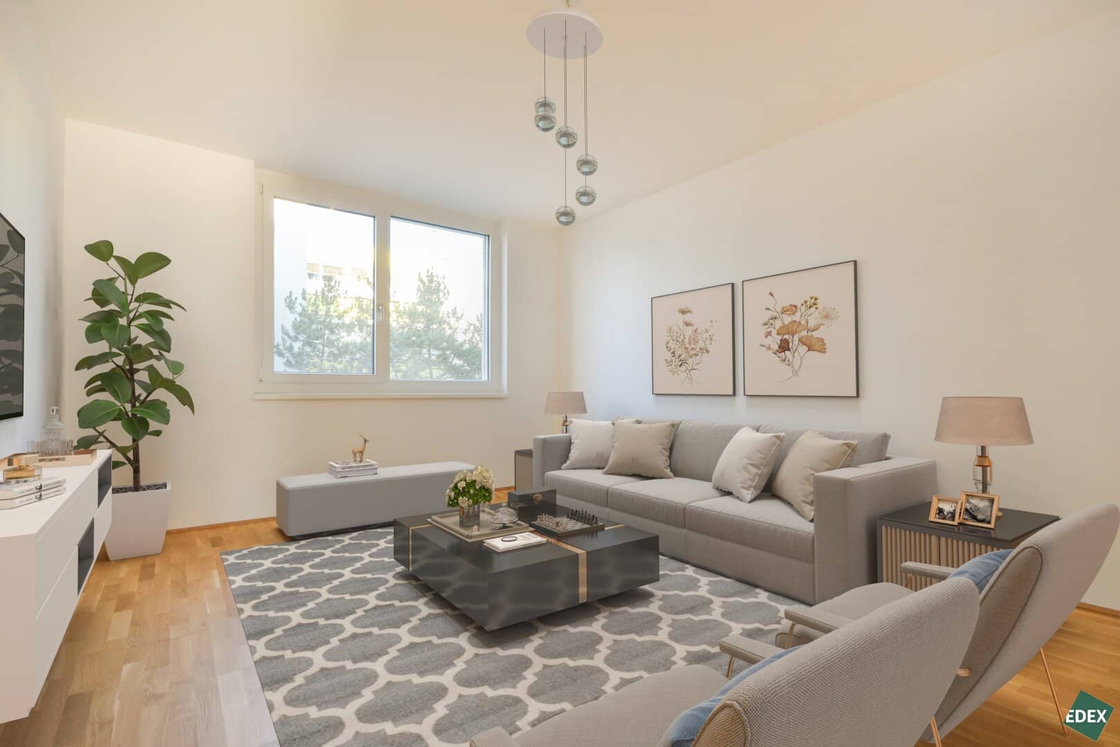Diese 3-Zimmer-Wohnung im 4. Stock mit ca. 72,74 m² besticht durch einen effizienten Grundriss. Sie verfügt über einen geräumigen Vorraum für Garderobe und Schränke, ein großzügiges Wohnzimmer mit Anschlüssen für eine Wohnküche, 2 Schlafzimmer, ein Bad mit Badewanne und Waschmaschinenanschluss sowie ein separates WC. Highlight ist der ca. 5,81 m² große Süd-Balkon mit Blick ins Grüne.