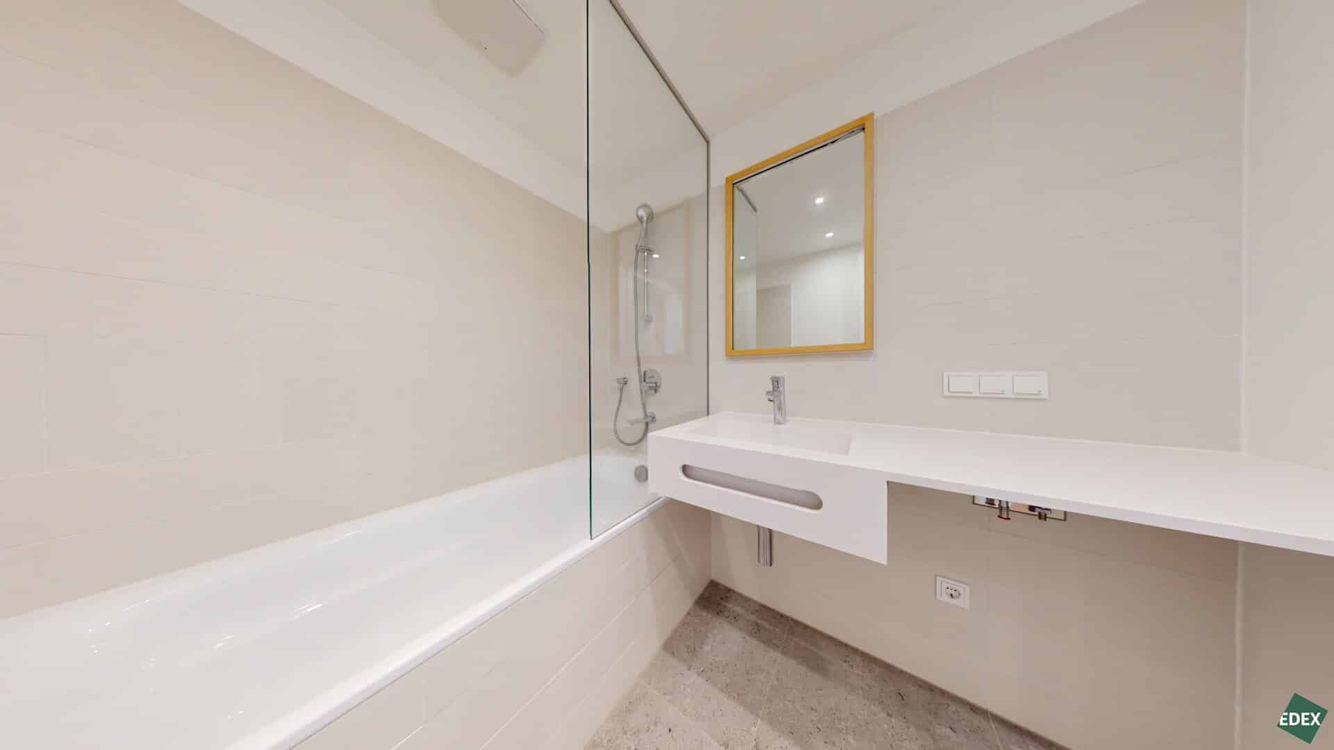 Separate Toiletten mit Handwaschbecken, stilvolle Bäder mit Badewanne, Handtuchheizkörper und Spiegel bieten Komfort mit durchdachtem Design. Der Waschmaschinenanschluss – je nach Wohnung im Bad oder Abstellraum – sorgt für maximale Alltagstauglichkeit.