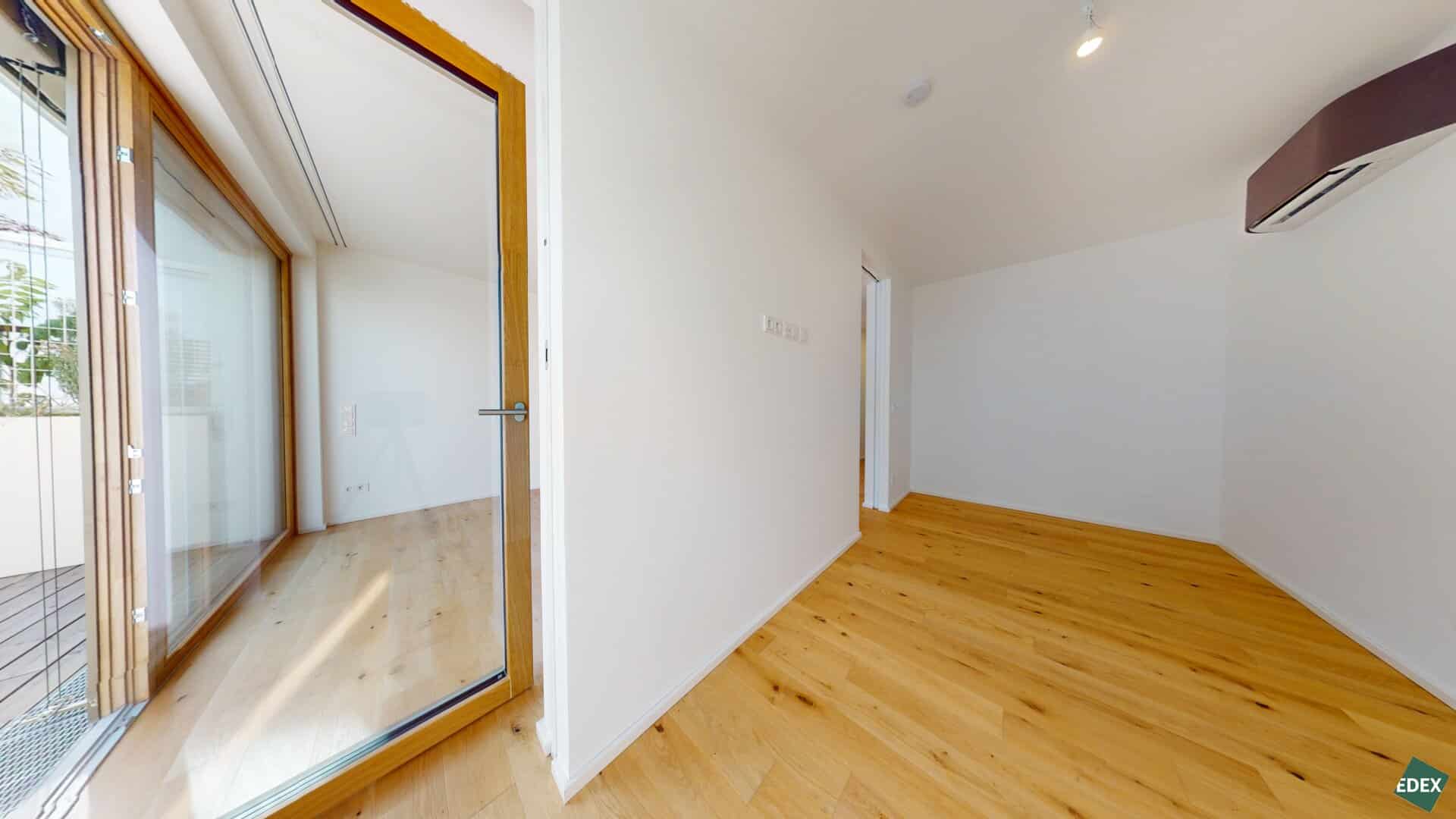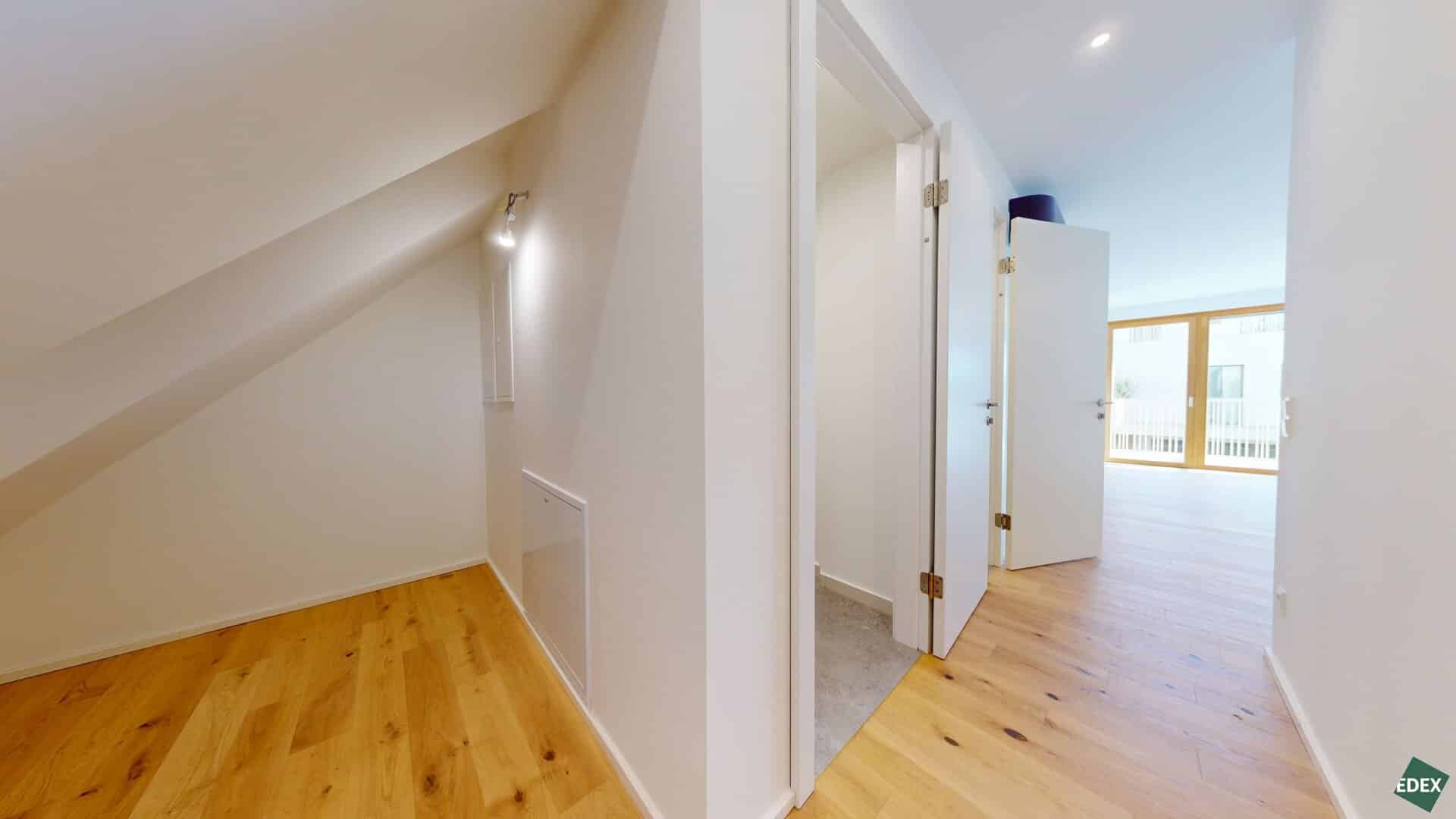 Ein außenliegender Sonnenschutz (fassadenintegrierte Raffstores) hält die Räume auch im Sommer angenehm kühl – im Dachgeschoss zusätzlich unterstützt durch moderne Klimageräte.