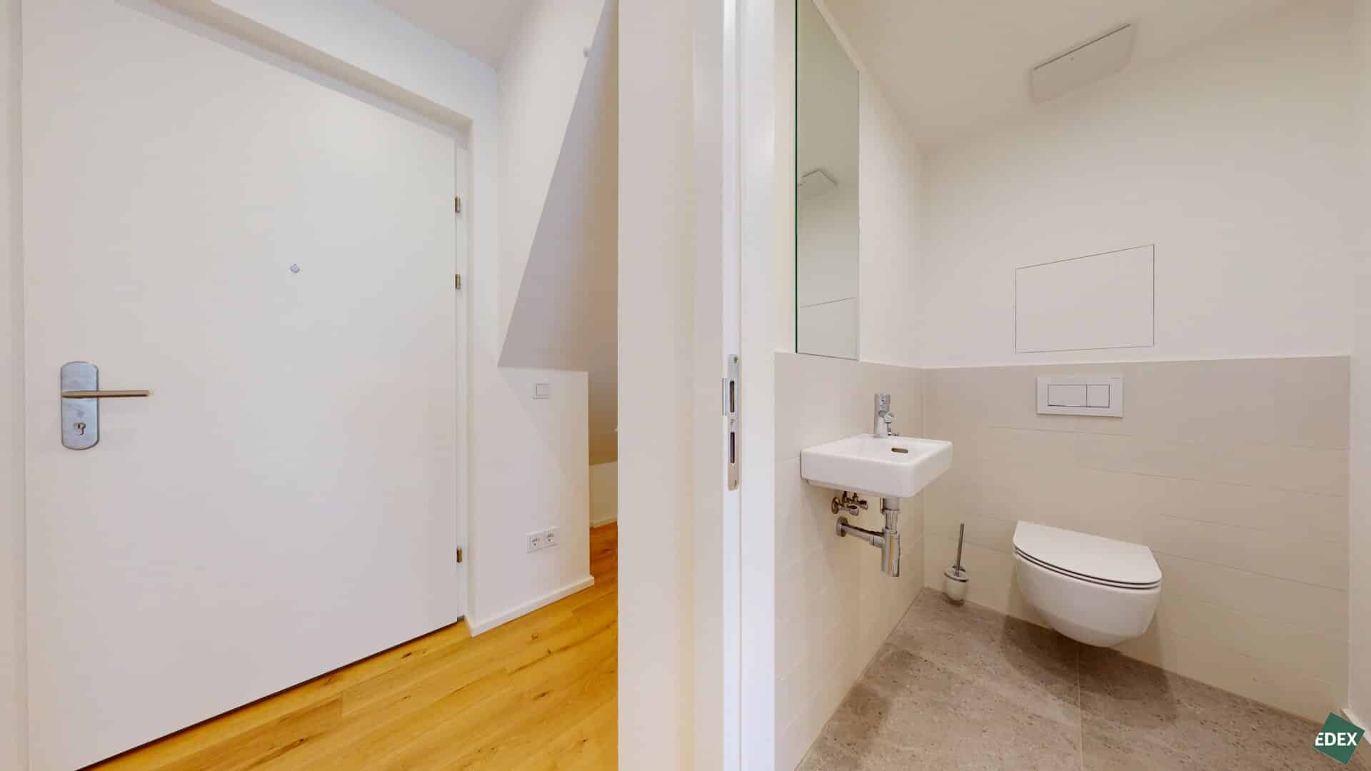 Separate Toiletten mit Handwaschbecken, stilvolle Bäder mit Badewanne, Handtuchheizkörper und Spiegel bieten Komfort mit durchdachtem Design. Der Waschmaschinenanschluss – je nach Wohnung im Bad oder Abstellraum – sorgt für maximale Alltagstauglichkeit.