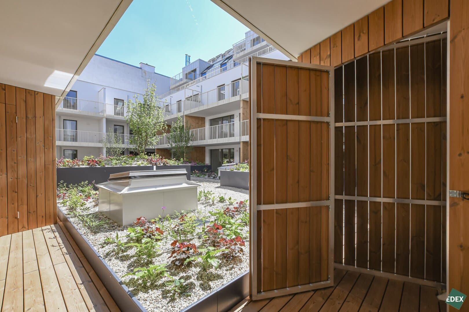 Auf den großzügigen Freiflächen schaffen bereits integrierte Pflanzentröge und Wasseranschlüsse Raum für Ihr eigenes kleines Grün im Innenhof – ideal zum Abschalten nach einem langen Tag.