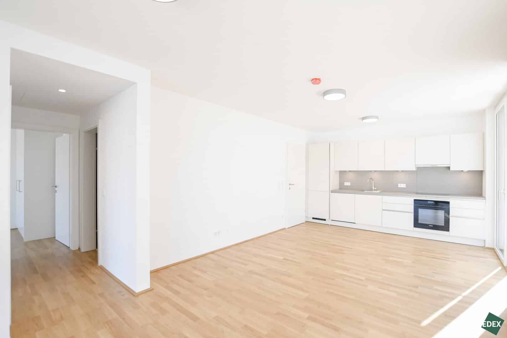 Die Wohnungen mit einer Größe von ca. 48 m² bis 137 m² verfügen über ein bis drei Zimmer und bieten großzügige Grundrisse mit durchdachter Raumaufteilung. Beinahe jede Einheit verfügt über eine Freifläche in Form von Balkon, Terrasse oder Garten – für mehr Licht, Luft und Lebensqualität. Die intelligente Raumnutzung vermittelt selbst bei kleineren Flächen Großzügigkeit. Der zentrale Wohnbereich mit offener Küche (ausgestattet mit modernen SIEMENS-Geräten) schafft einen harmonischen Mittelpunkt für entspanntes Wohnen.