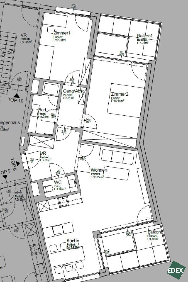 Zur Vermietung gelangt eine schöne 3-Zimmer-Wohnung in ruhiger Wohnlage. Die moderne Wohnung verfügt über einen Vorraum, ein separates WC, ein geräumiges Wohnzimmer inkl. einer modernen Einbauküche, ein Badezimmer mit Dusche, Waschbecken und Waschmaschinen-Anschluss sowie zwei Schlafzimmer. Der Balkon ist über das Wohnzimmer aus erreichbar. Zudem gibt es einen zweiten Balkon, welcher vom Schlafzimmer aus erreichbar ist. Die Fenster sind mit Raffstores/außenliegenden Sonnenschutz ausgestattet. Die Wohnräume sind mit Parkettböden und die Nassräume sind mit eleganten Fliesen ausgestattet.