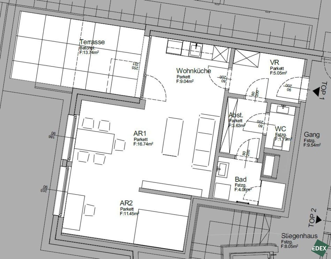 Zur Vermietung gelangt eine schöne 1,5-Zimmer-Wohnung in ruhiger Wohnlage. Die moderne Wohnung verfügt über einen Vorraum, ein separates WC, ein geräumiges Wohnzimmer inkl. moderner Einbauküche, einen Abstellraum, ein Badezimmer mit Dusche, Waschbecken und Waschmaschinen-Anschluss sowie eine Nische im Wohnzimmer, der sich gut als Schlafzimmer eignet. Die Terrasse ist über das Wohnzimmer aus erreichbar. Die Fenster sind mit Raffstores/außenliegenden Sonnenschutz ausgestattet. Die Wohnräume sind mit Parkettböden und die Nassräume sind mit eleganten Fliesen ausgestattet.