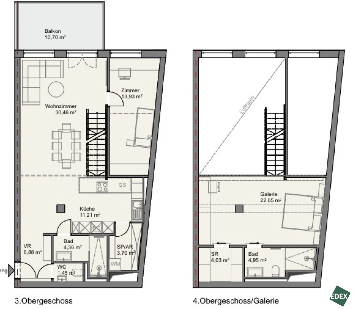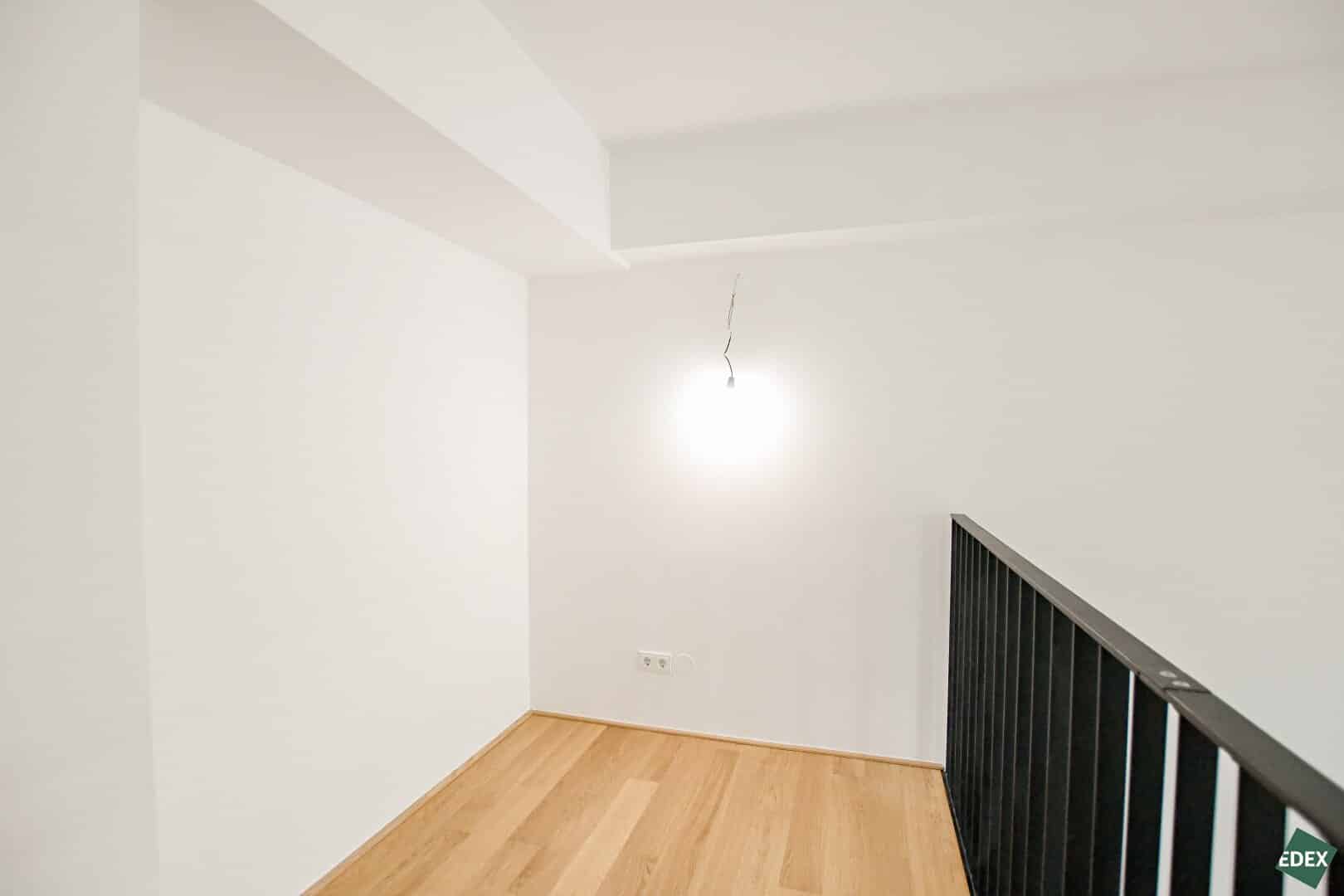 Über eine moderne Treppe erreicht man die Galerieebene (ca. 31 m²): Diese bietet Platz für einen offenen Arbeits- oder Loungebereich sowie einen abgetrennten Raum mit weiterem Badezimmer inkl. WC – ideal als zweiter Schlafbereich oder Rückzugsort.