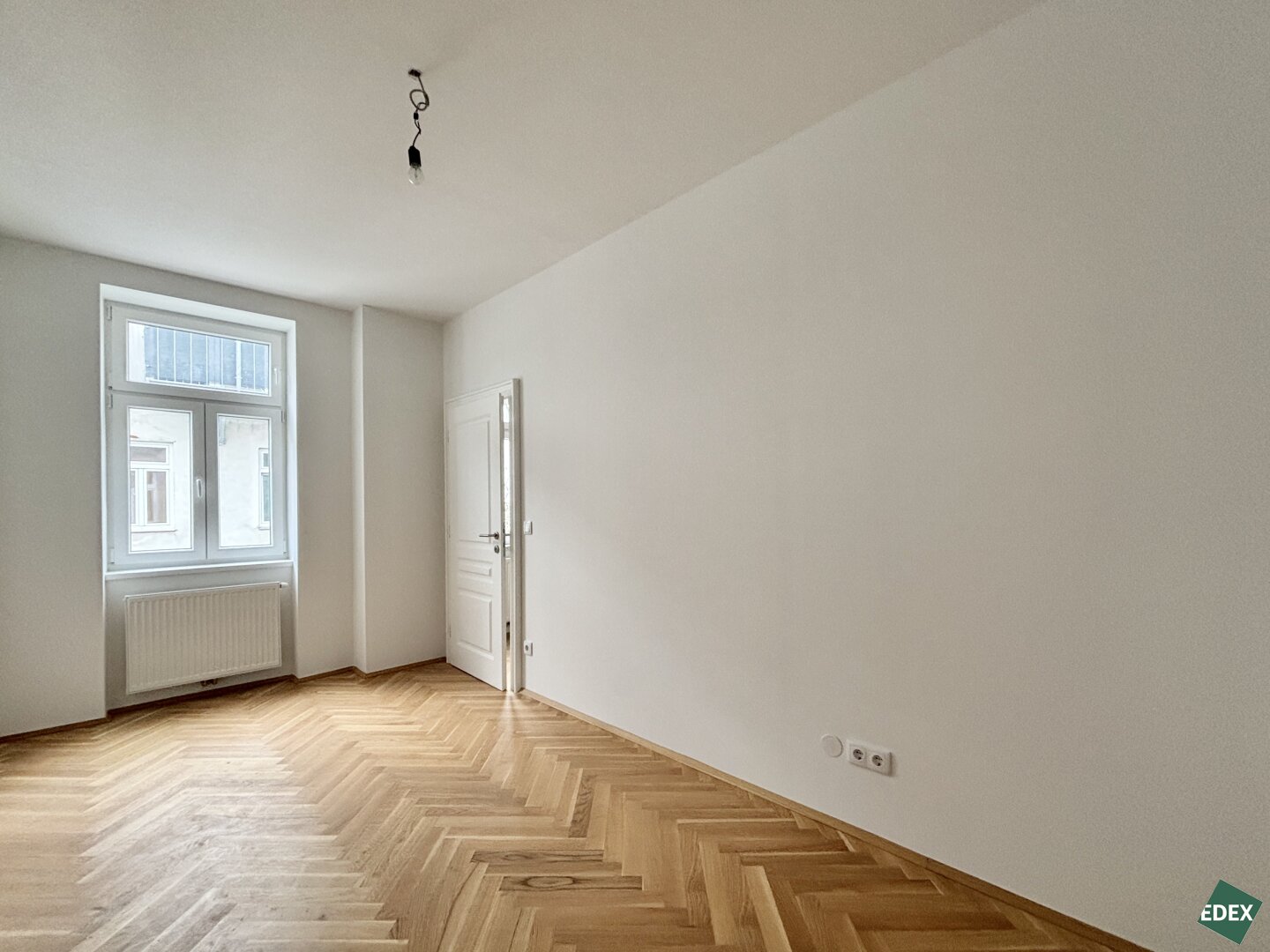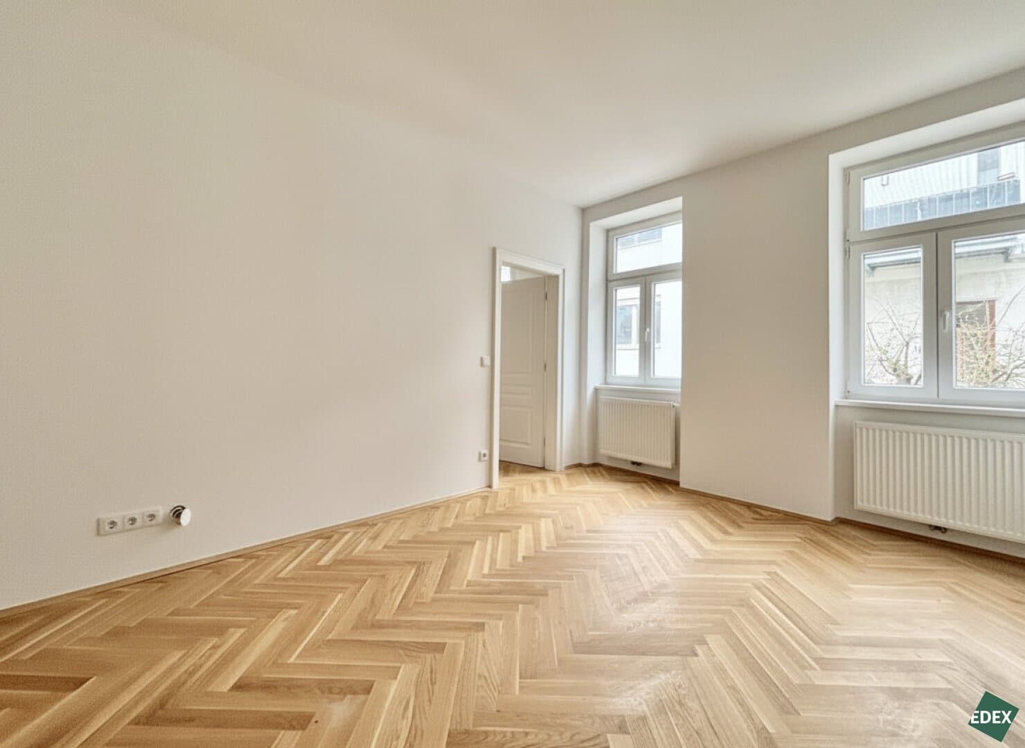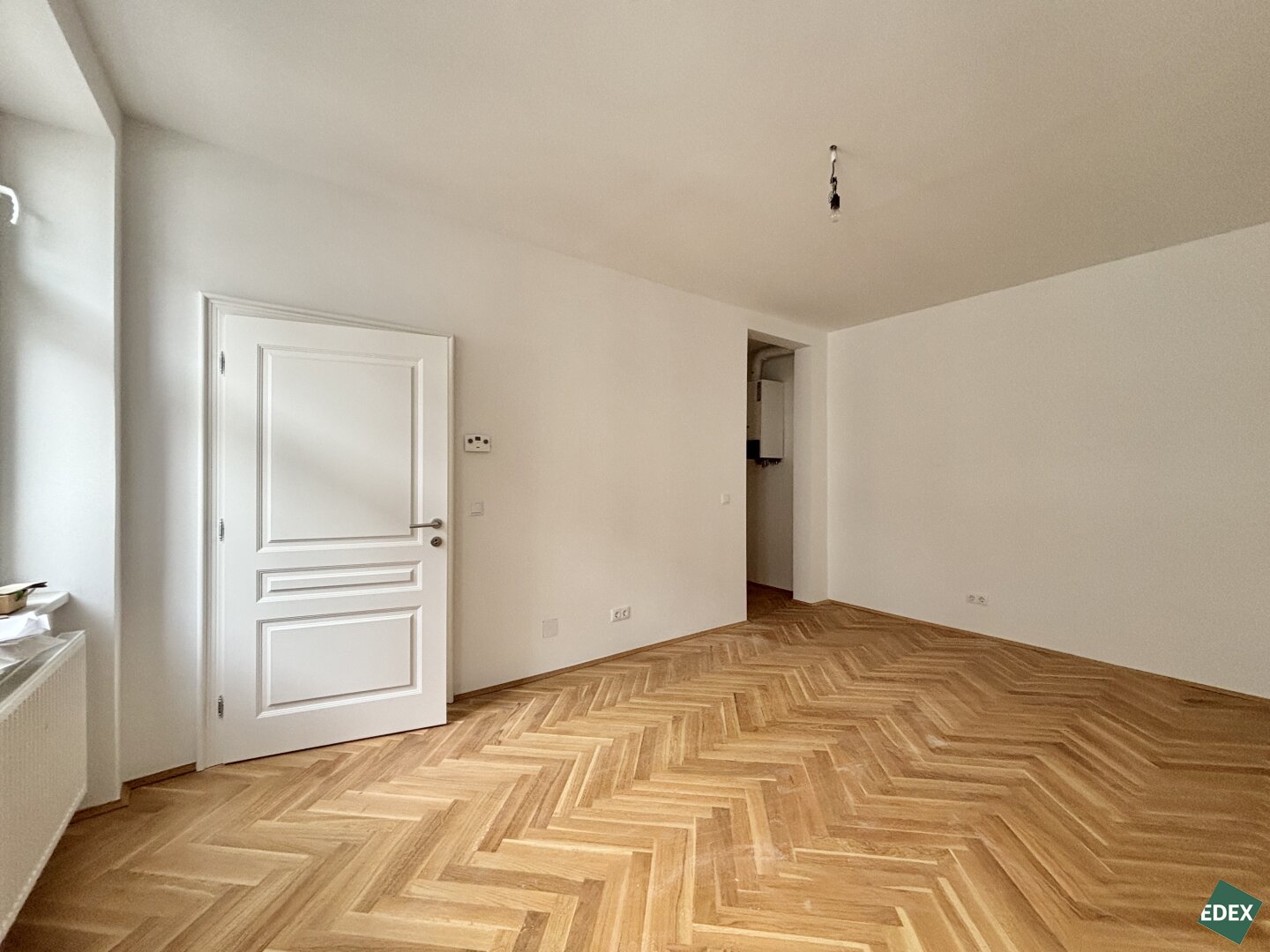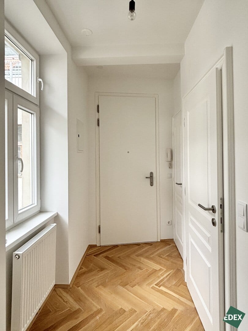 Die Wohnung wurde hochwertig generalsaniert und bietet eine durchdachte Raumaufteilung: Vom Vorraum aus sind sowohl das separate WC mit Fenster als auch das Badezimmer mit Dusche, Waschbecken und Waschmaschinenanschluss erreichbar. Weiters gelangt man vom Vorraum in das Wohnzimmer mit einer Kochnische samt Anschlüssen für eine Küche. Das ca. 13,5 m² große Schlafzimmer ist vom Wohnzimmer aus begehbar. Der Wohnung ist außerdem ein ehemaliges Gang-WC direkt neben dem Wohnungseingang zugeordnet, das nun als praktischer Abstellraum genutzt werden kann.