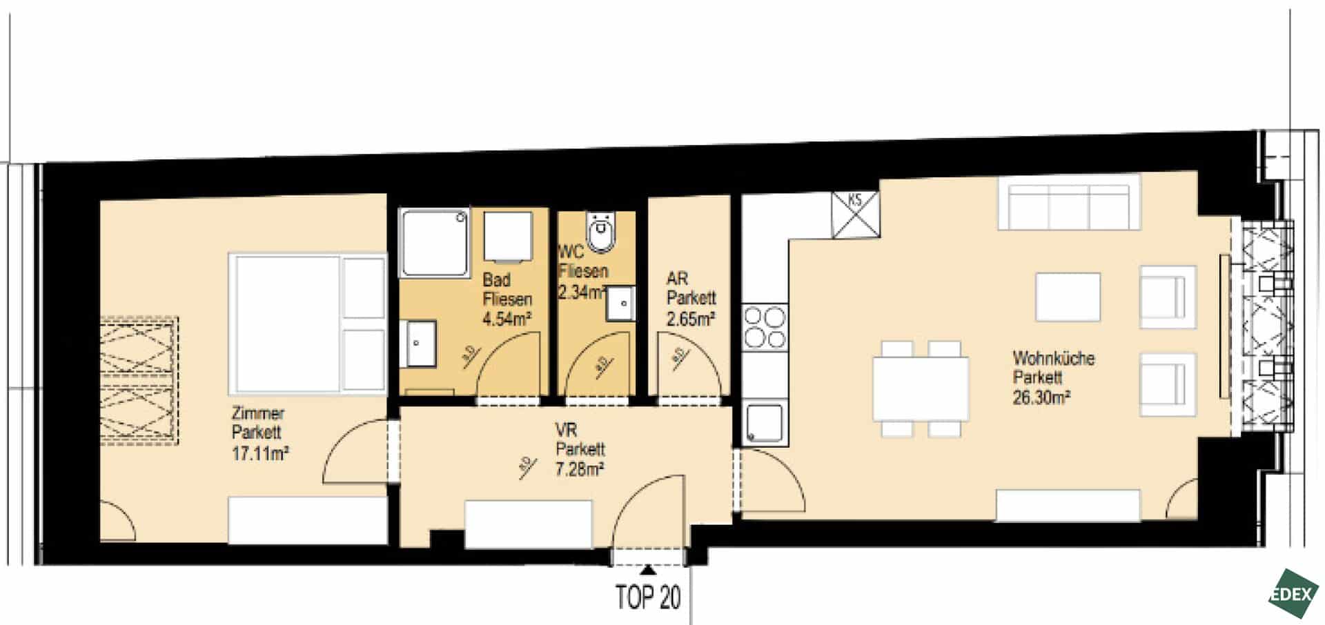 Der durchdachte Grundriss bietet einen geräumigen Vorraum, ein separates WC, einen Abstellraum, ein modernes Badezimmer mit Dusche und Waschmaschinen-Anschluss, ein separates Schlafzimmer sowie ein helles Wohnzimmer mit Küche. Die Küche ist vollständig ausgestattet und punktet mit zeitlosem Design.