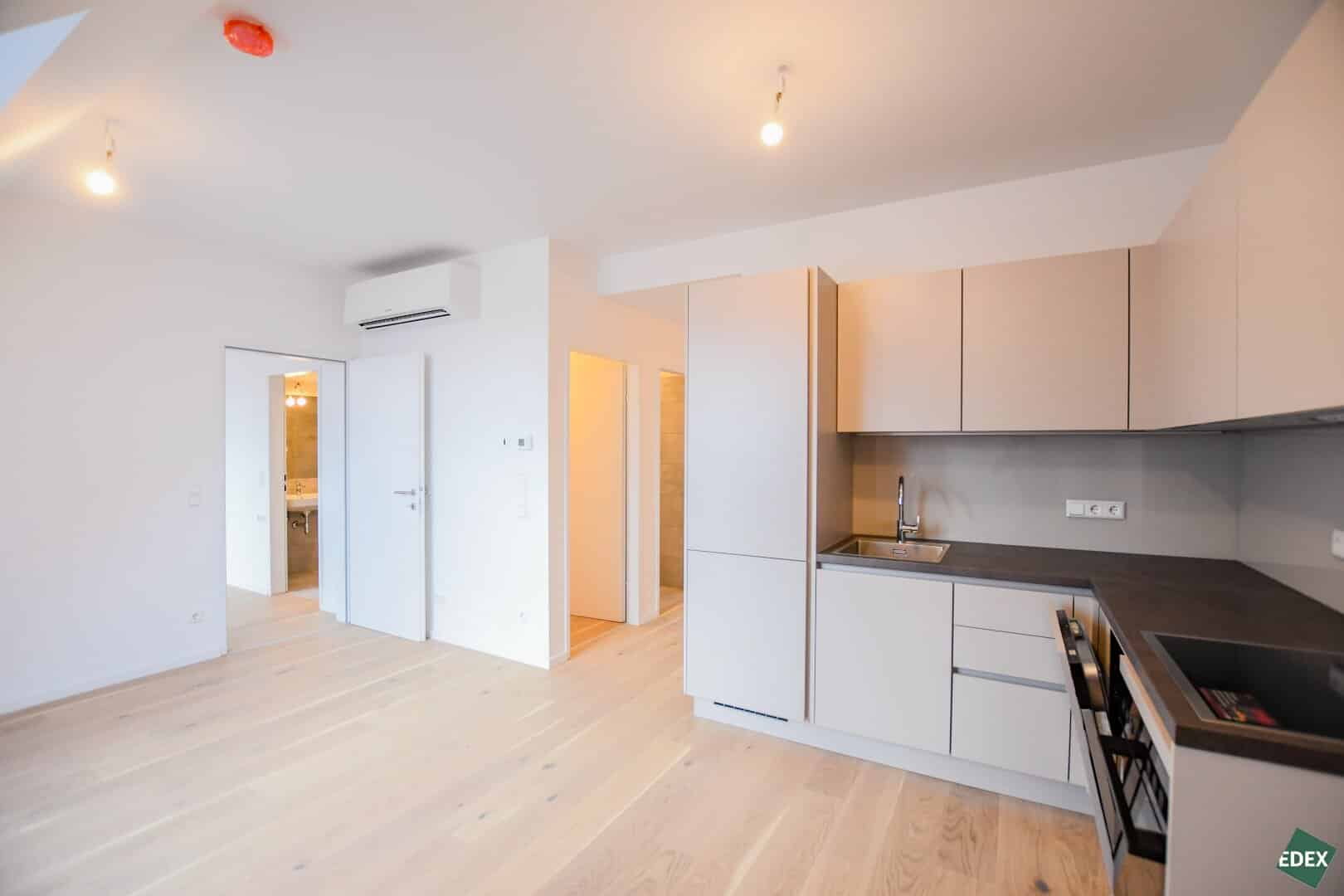 Der durchdachte Grundriss bietet einen geräumigen Vorraum, ein separates WC, ein modernes Badezimmer mit Dusche und Waschmaschinen-Anschluss, ein separates Schlafzimmer mit Schrankraum sowie ein helles Wohnzimmer mit Küche und Abstellraum. Die Küche ist vollständig ausgestattet und punktet mit zeitlosem Design.