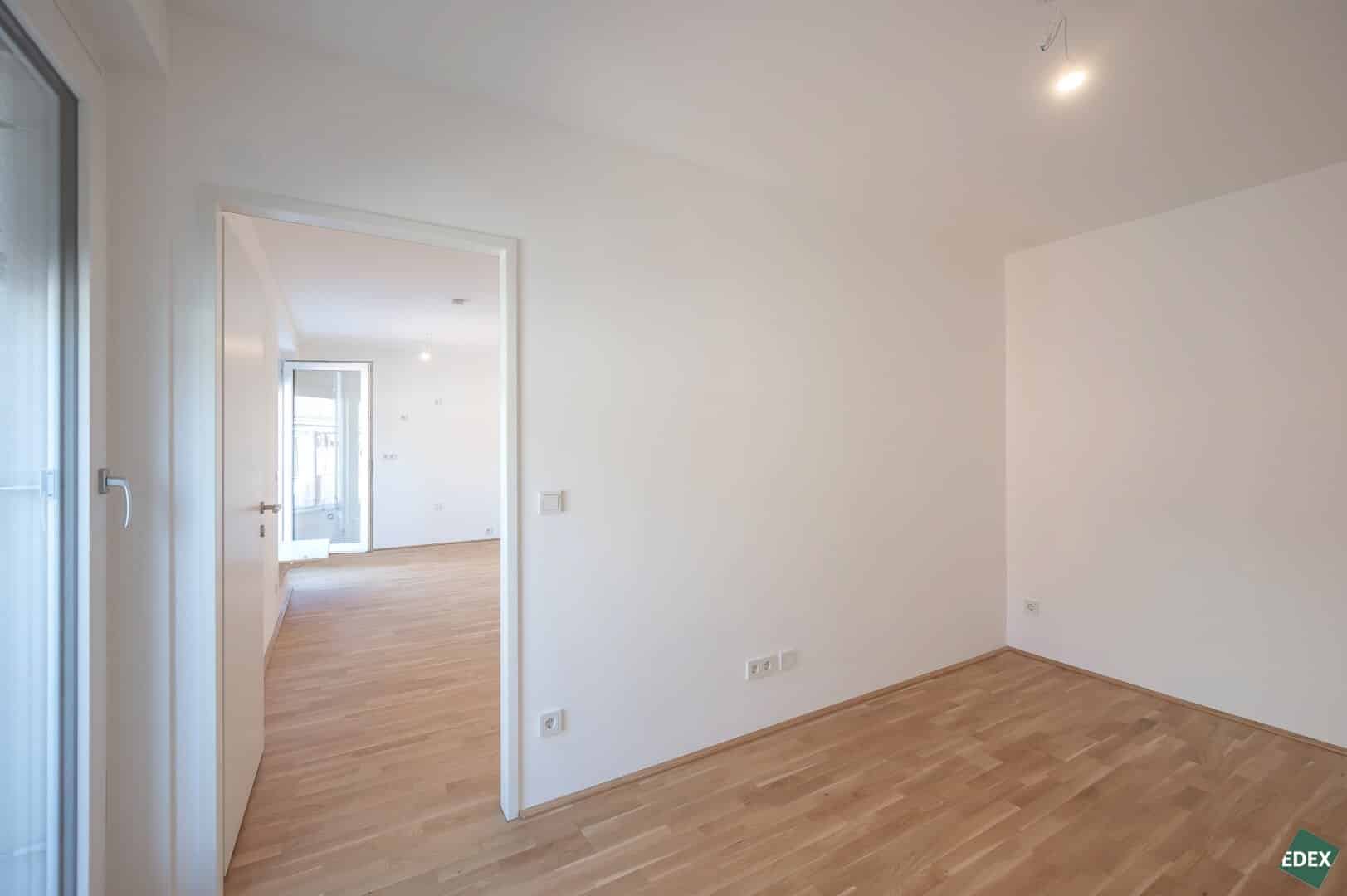 Alle 44 Eigentumswohnungen verfügen über äußerst effiziente Grundrisse sowie teilweise über Balkon, Terrasse oder Eigengarten, die Nutzflächen der Wohnungen liegen zwischen 32 m² und 91 m². Moderne, elegante Bäder und hochwertige Parkettböden schaffen eine zeitgemäße Wohnatmosphäre. Eine Wärmepumpe sowie eine Photovoltaik-Anlage mit einer Leistung von mindestens ca. 3,46 kWp sorgen für eine umweltschonende Energieversorgung. Durch Einsatz eines Smart-Home-Systems, können Haustüren über das Smartphone aufgesperrt oder Informationen zum Gebäude von unterwegs abgerufen werden. In der Garage stehen 21 Garagenplätze zur Verfügung, E-Ladestationen können nachgerüstet werden.