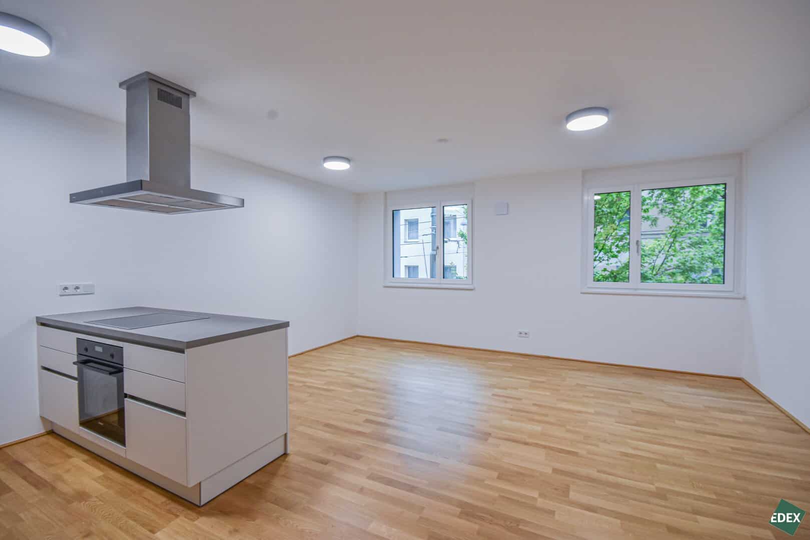Die Wohnungen mit einer Größe von ca. 55 m² bis 85 m² verfügen über drei Zimmer und bieten großzügige Grundrisse mit durchdachter Raumaufteilung. Beinahe jede Einheit verfügt über eine Freifläche in Form von Balkon oder Terrasse – für mehr Licht, Luft und Lebensqualität. Die intelligente Raumnutzung vermittelt selbst bei kleineren Flächen Großzügigkeit. Der zentrale Wohnbereich mit offener Küche (ausgestattet mit modernen SIEMENS-Geräten) schafft einen harmonischen Mittelpunkt für entspanntes Wohnen.