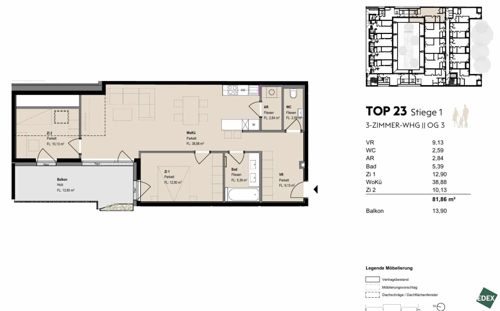 - Jede Wohnung verfügt über eine Freifläche (Balkon, Loggia oder Terrasse)