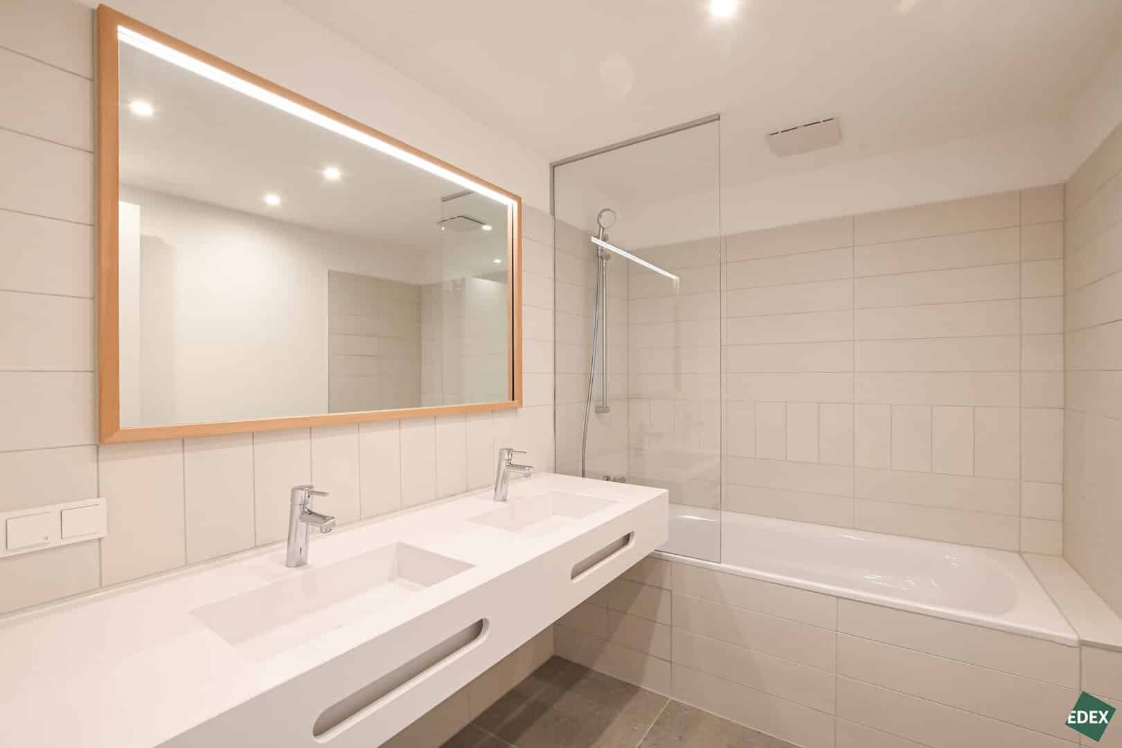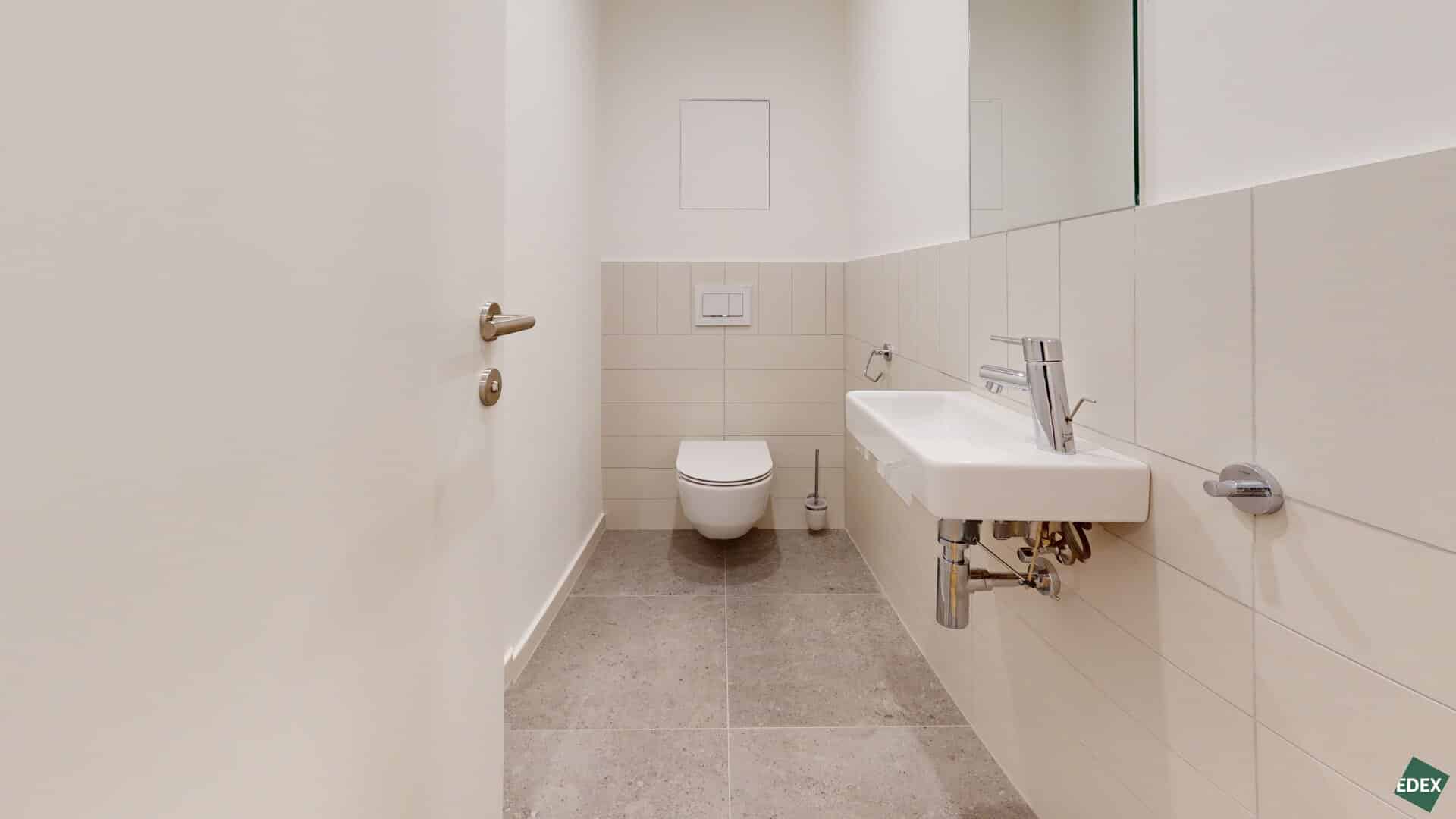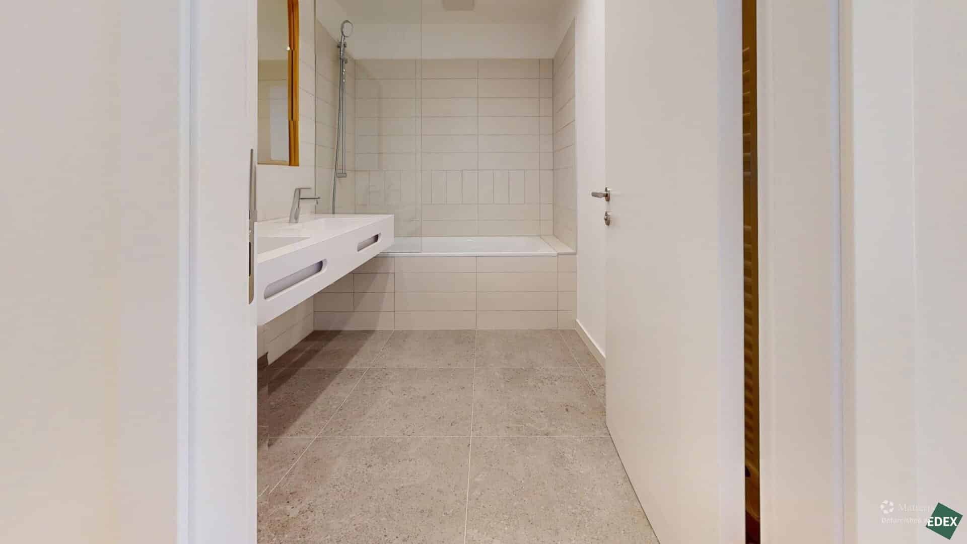 Separate Toiletten mit Handwaschbecken, stilvolle Bäder mit Badewanne, Handtuchheizkörper und Spiegel bieten Komfort mit durchdachtem Design. Der Waschmaschinenanschluss – je nach Wohnung im Bad oder Abstellraum – sorgt für maximale Alltagstauglichkeit.