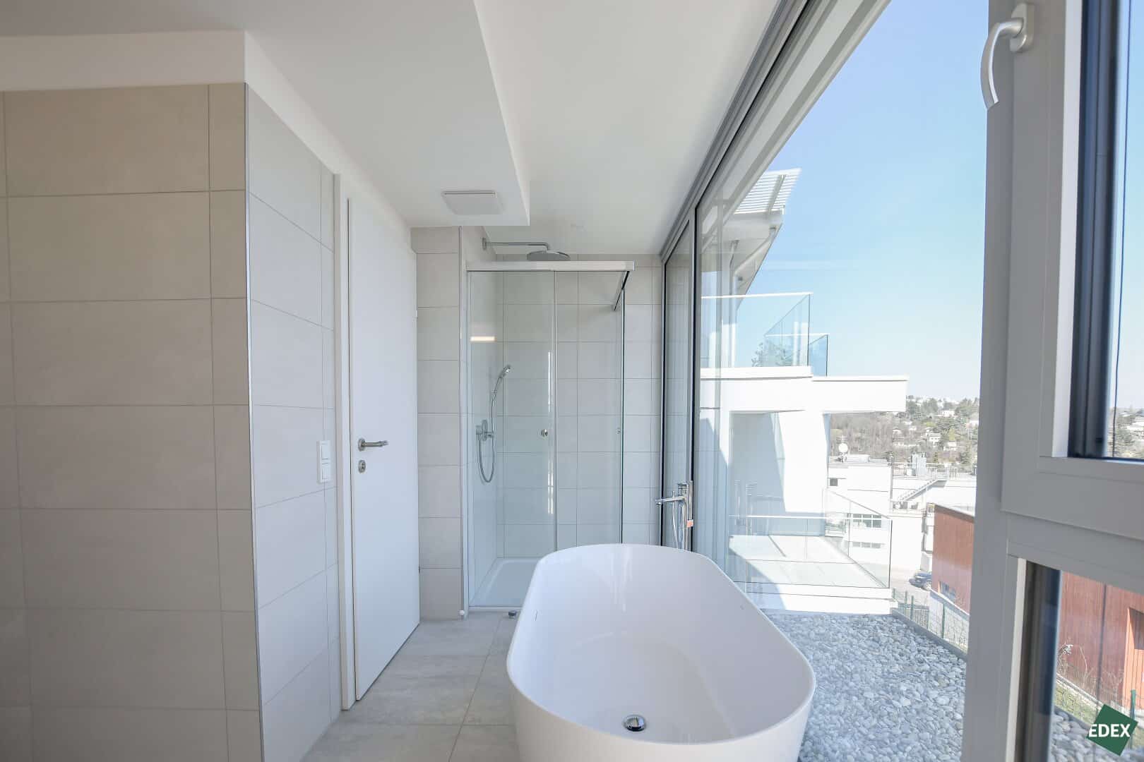 Im Dachgeschoss befindet sich ein weiterer großzügiger Wohn- bzw. Schlafraum, ein großes Badezimmer, ein separates WC, ein zusätzlicher Stauraum sowie ein weiterer Balkon. Die angrenzenden Flachdachbereiche sind nicht begehbar.