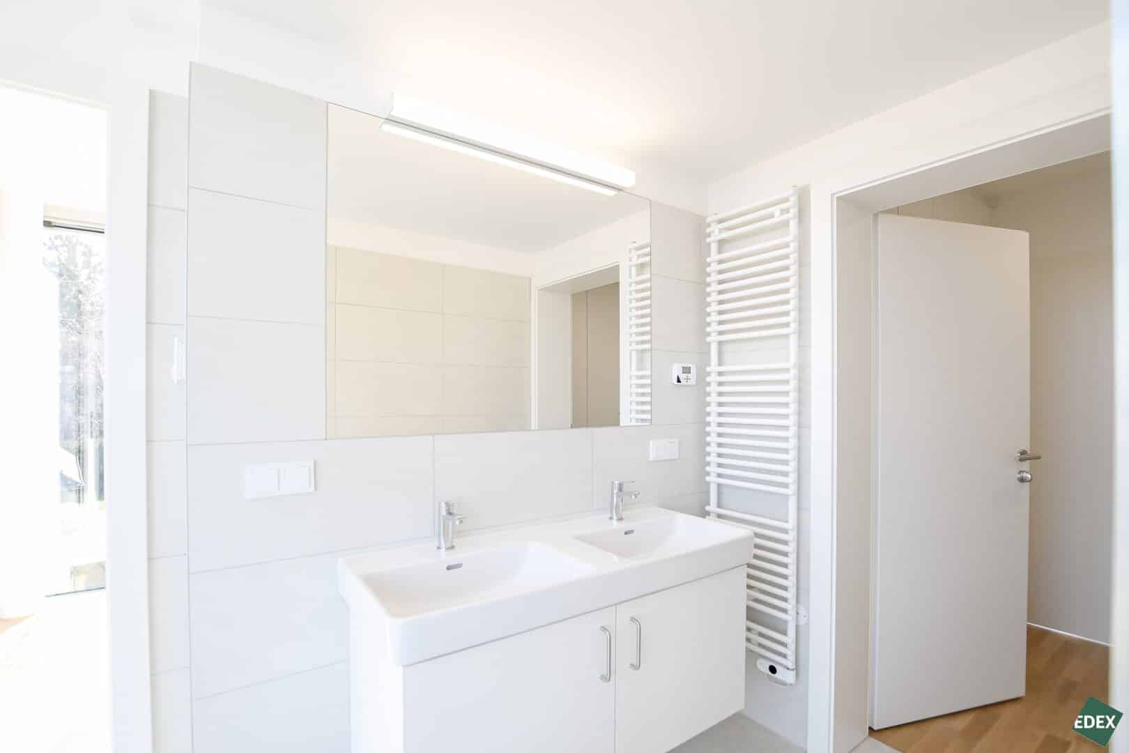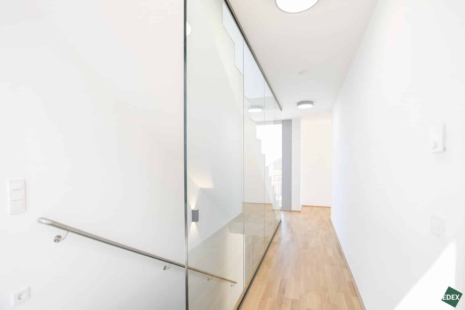 Die Wohnräume sind mit Parkettböden ausgestattet, die Sanitärbereiche mit hochwertigen Fliesen. Sämtliche Fenster verfügen über außenliegenden Sonnenschutz.