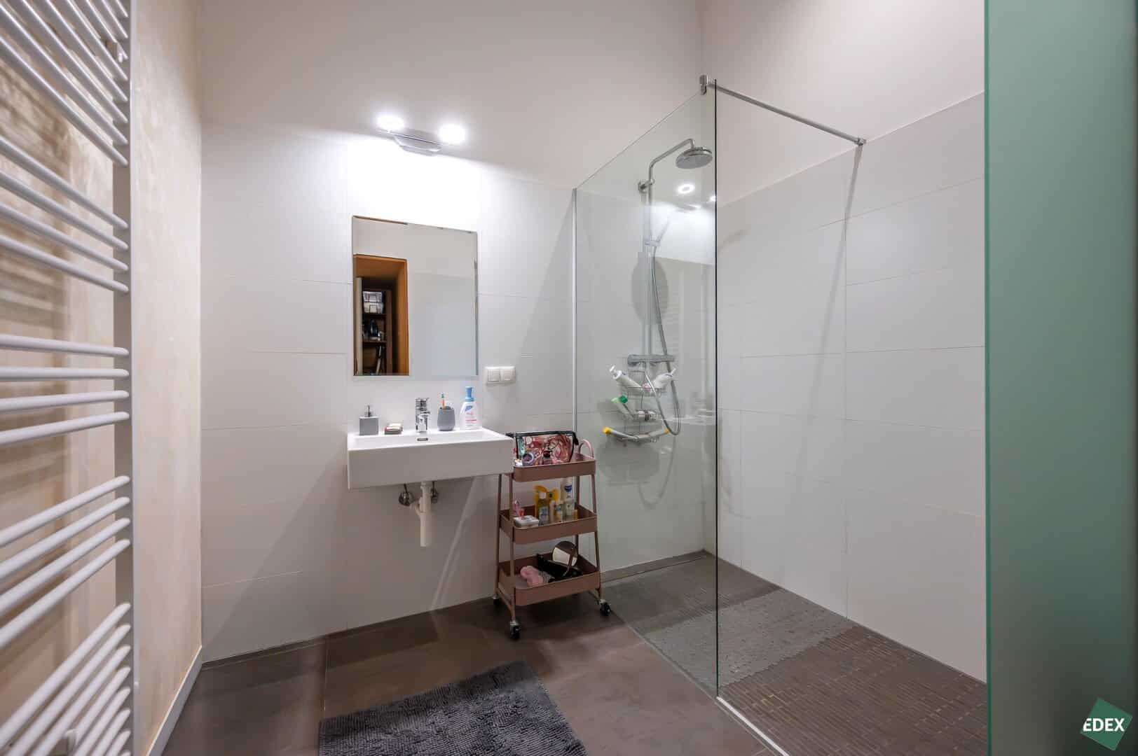 - Bathroom with shower, washbasin, and towel radiator