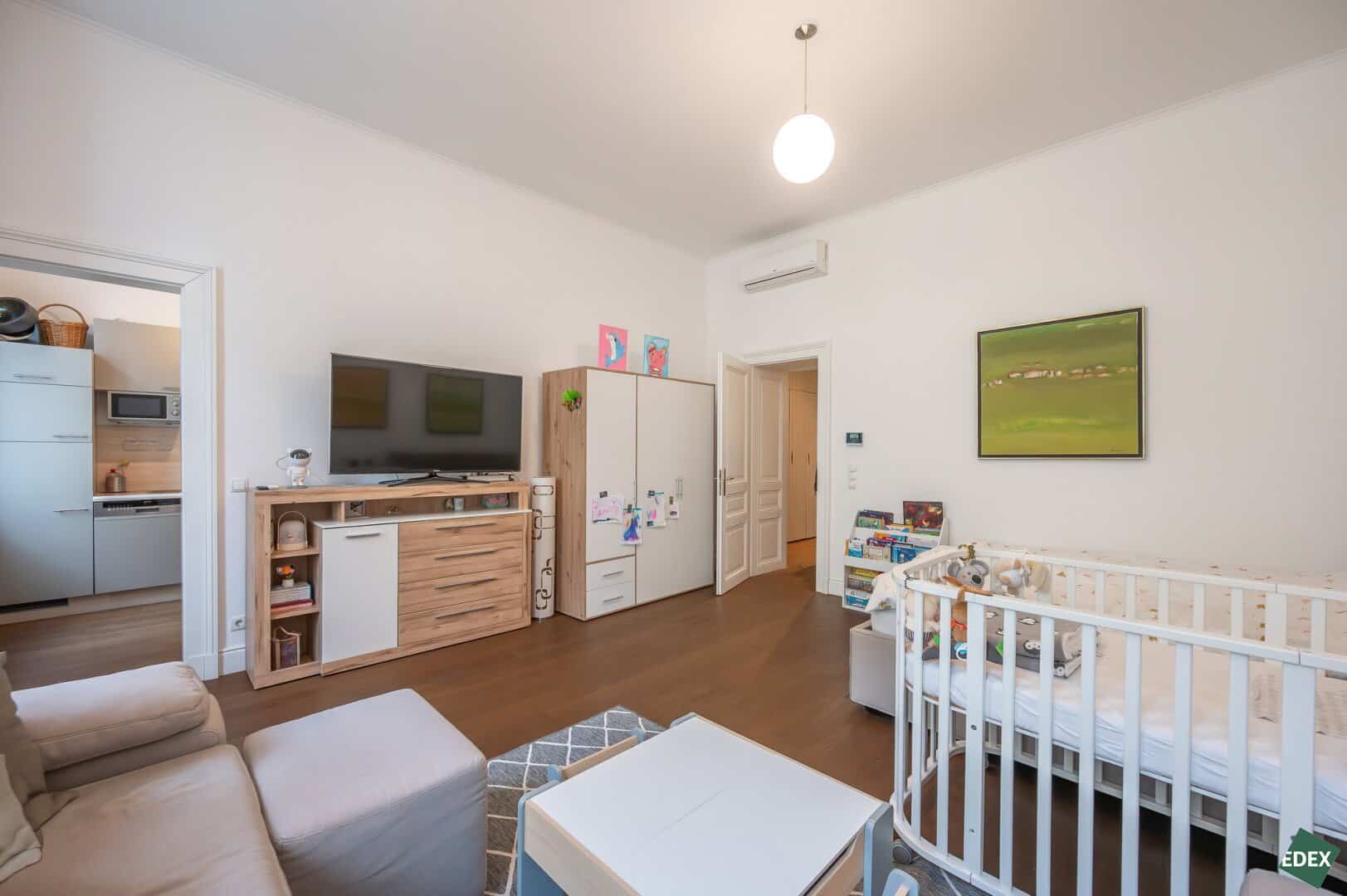 The quiet bedroom, facing the courtyard, features a private balcony. An additional large room (currently used as a children’s room) can serve as a living room. From there, you access the separate kitchen (IKEA), which is included in the purchase price (except for the small refrigerator). The kitchen is fully equipped and has a window.