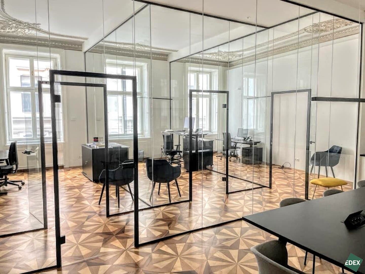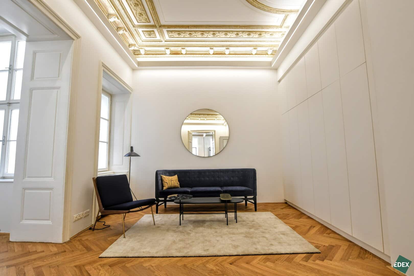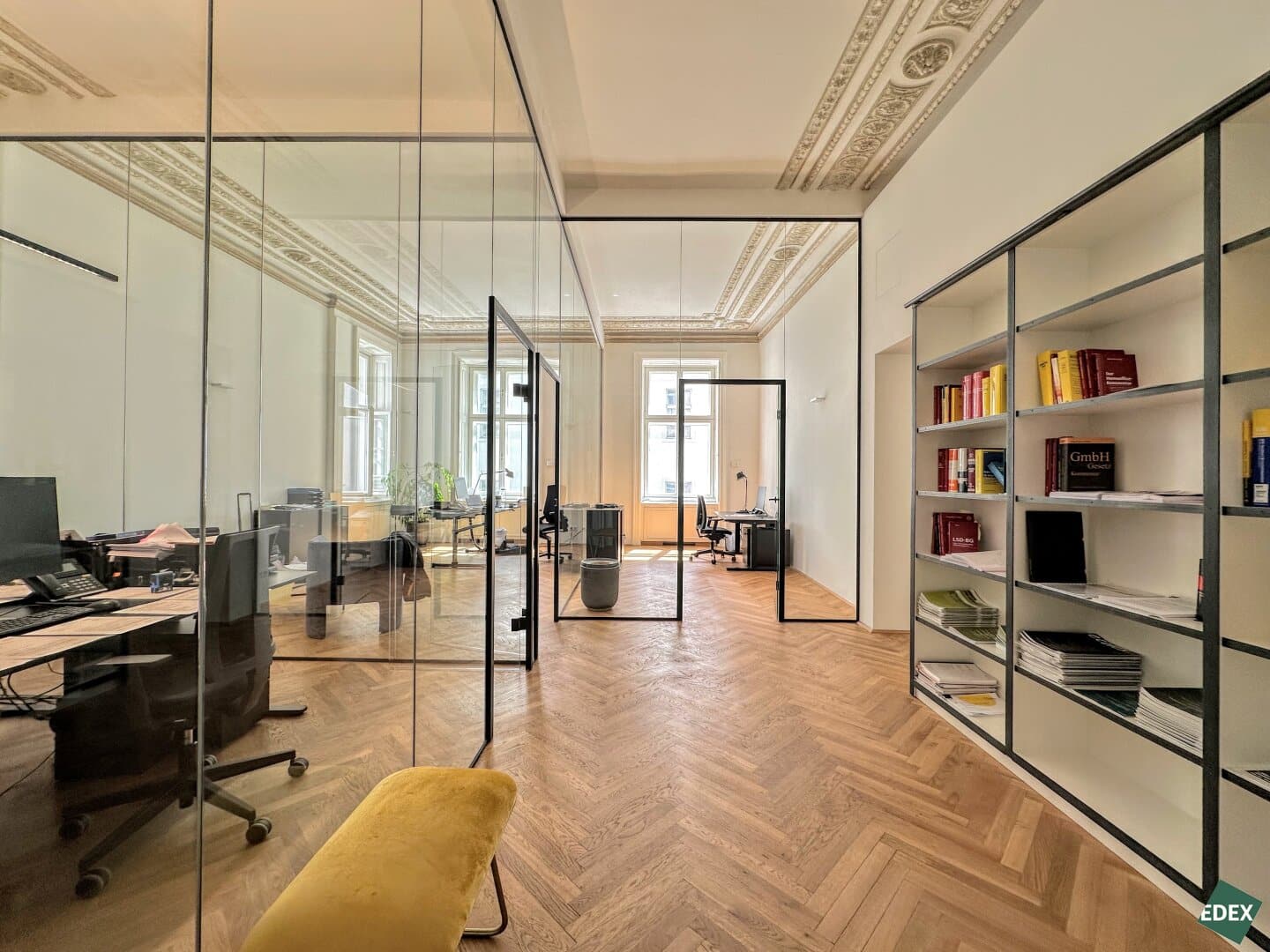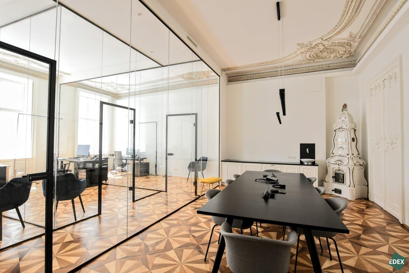 Aufgrund der effizienten Anordnung und dem hochwertigen Ausbau ist ein repräsentativer Unternehmensauftritt garantiert. Beispielsweise wurde der hochbarocke Deckenstuck aufwändig saniert und verleiht der Fläche in seiner Naturbelassenheit eine unaufdringliche Eleganz. Die restaurierten Wiener Kastenfenster inkl. sanierten Innenflügeln und Isolierverglasung ermöglichen einen sehr guten Schallschutz und stellen eine ruhige Arbeitsatmosphäre sicher. Großzügige Flügeltüren, hochwertiger Parkettboden und ein wunderschöner Antiker Kachelofen runden das Bild einer einzigartigen Bürofläche in einem klassischen Wiener Stadthaus ab. Hier passt alles zusammen.