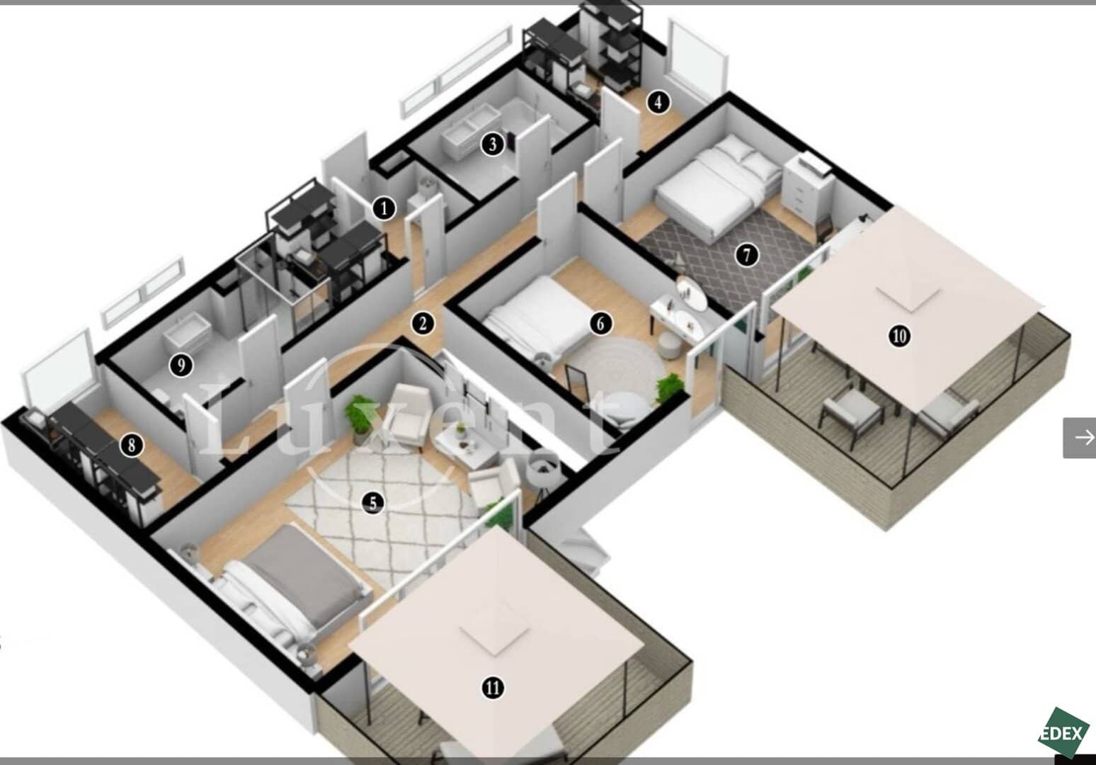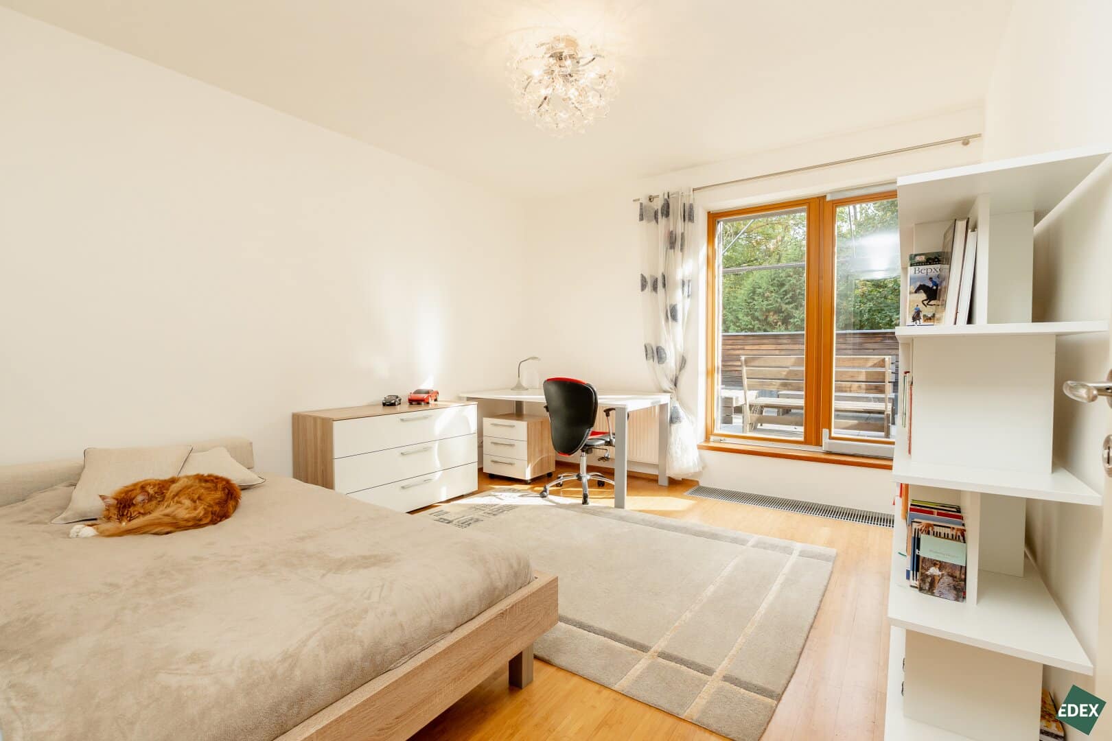 Beide Zonen sind durch einen Flur voneinander getrennt und verfügen jeweils über ein eigenes Badezimmer, Ankleidezimmer und eine Terrasse – was allen Familienmitgliedern maximale Privatsphäre bietet.