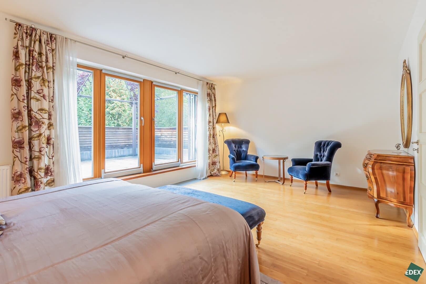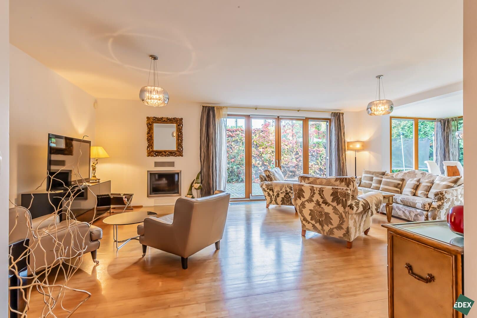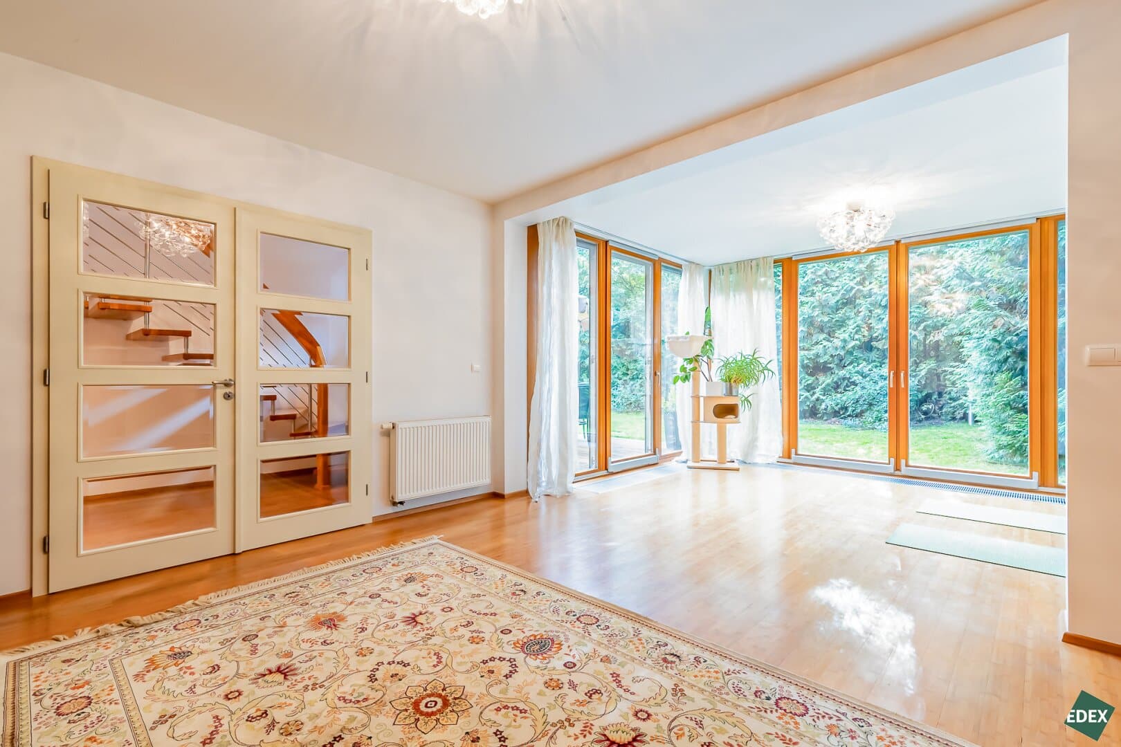 Große französische Fenster sorgen für reichlich Tageslicht und verleihen dem Interieur Helligkeit und Eleganz.