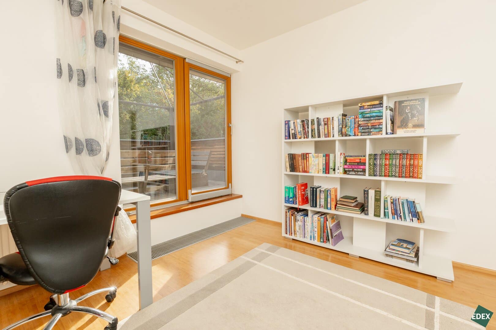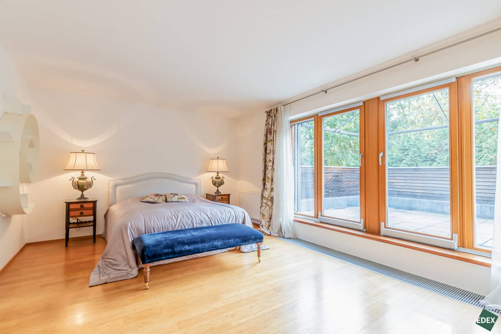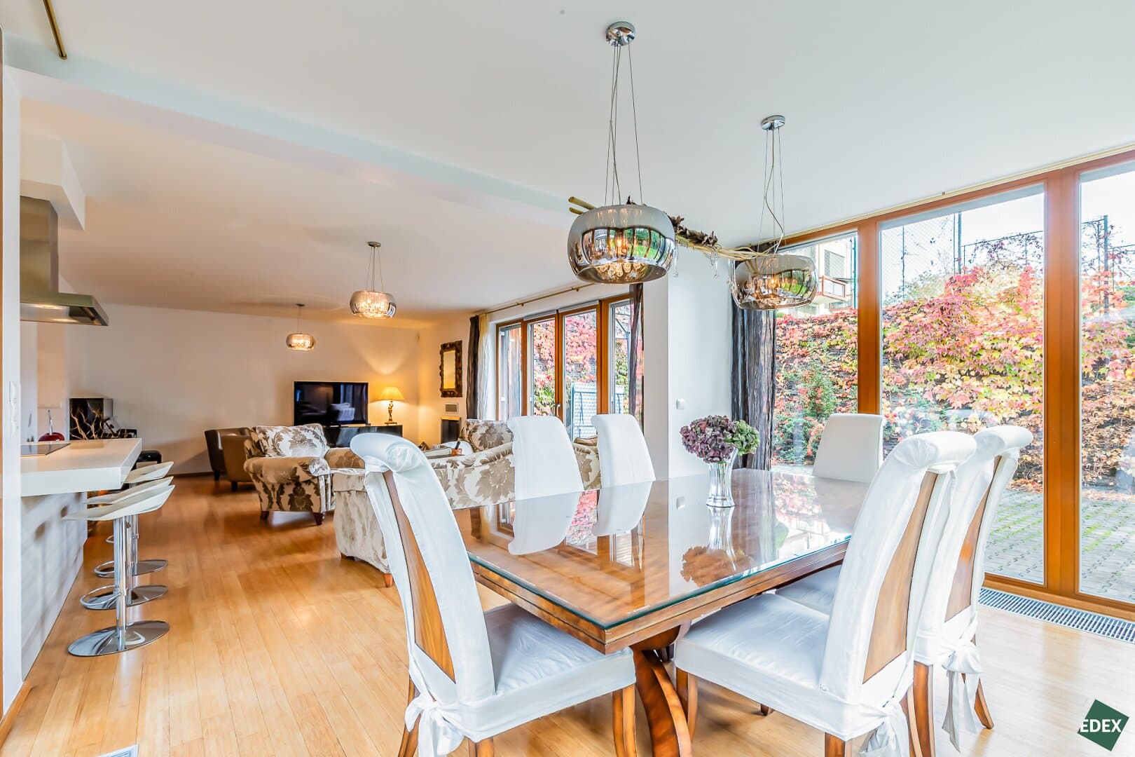 Große französische Fenster sorgen für reichlich Tageslicht und verleihen dem Interieur Helligkeit und Eleganz.