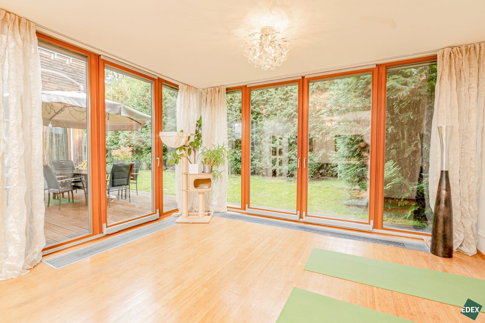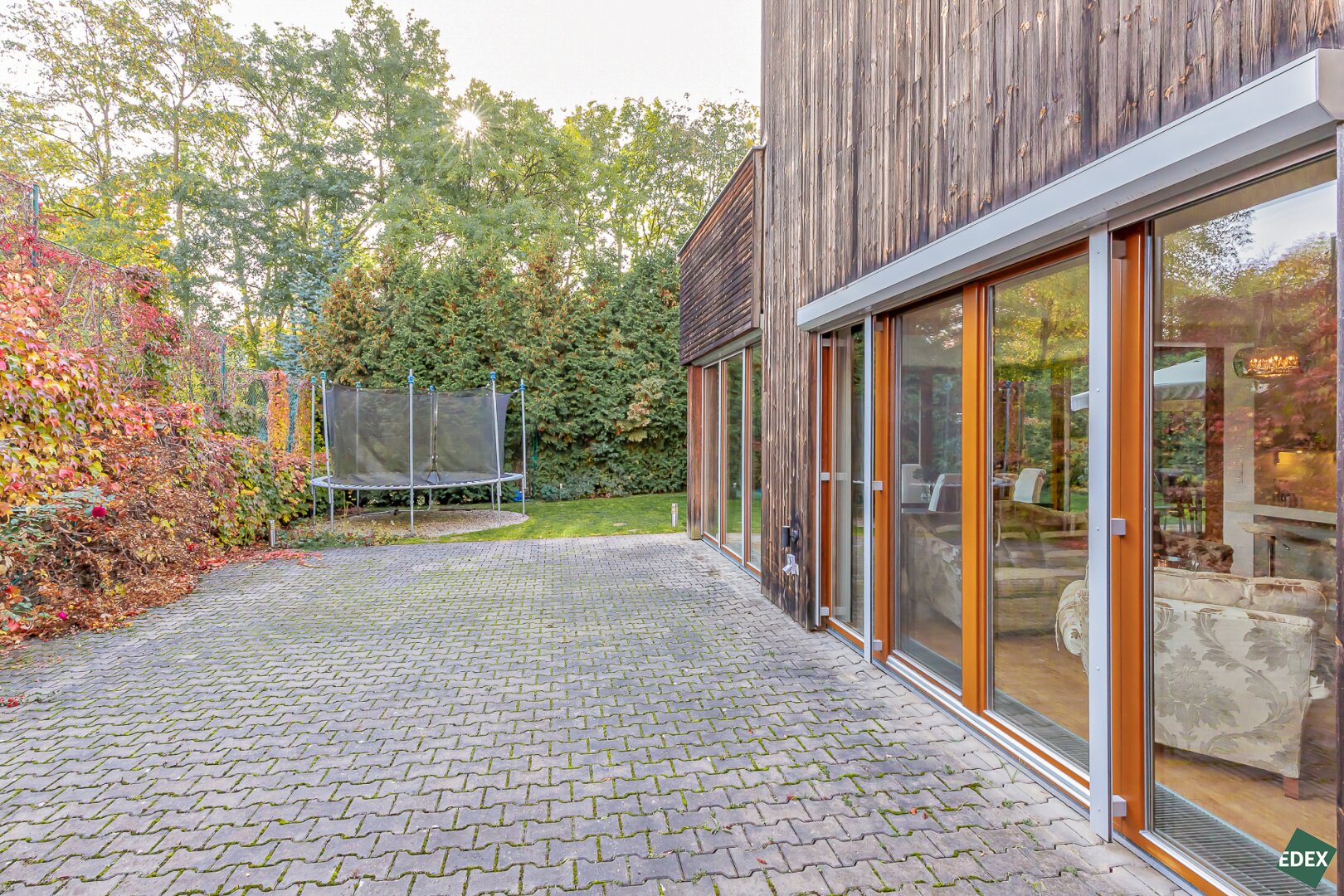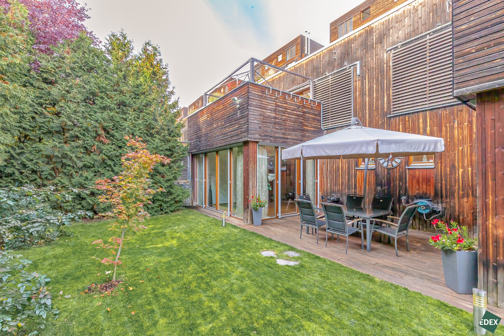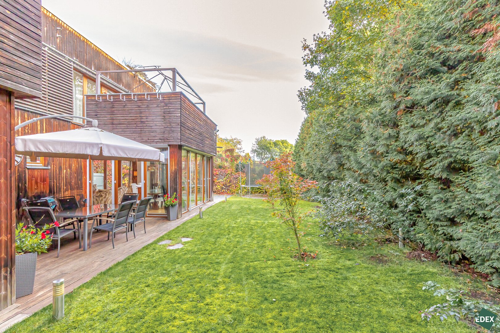 Die beiden Wohn-Räume im Erdgeschoss verfügen über einen direkten Zugang in den Garten, der von etwa 7 Meter hohen Lebensbäumen (Thuja) umgeben ist und somit absolute Privatsphäre bietet.