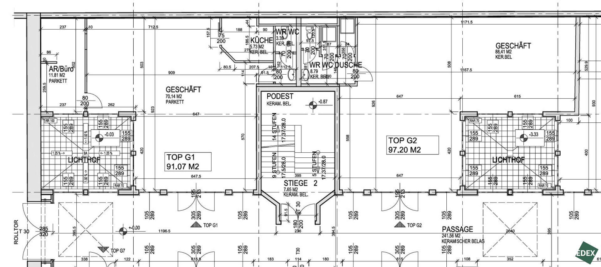 Die Einheiten befinden sich in der Passage im Erdgeschoss des Hauses. Das gegenständliche Objekt besteht aus der Fläche G01+G02 welche miteinander verbunden werden könnten.