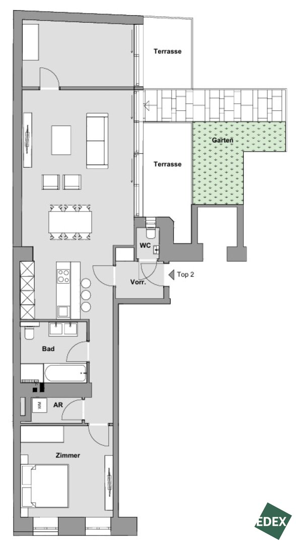 Die dargestellte Möblierung, einschließlich Küche und Begrünung, versteht sich ausschließlich als Gestaltungsvorschlag und ist nicht Bestandteil des Lieferumfangs oder des Vertrages. Die angegebenen Raum- und Wohnungsgrößen sowie Raumhöhen sind Richtwerte und können sich geringfügig ändern. Bauübliche Toleranzen bleiben vorbehalten. Sämtliche Maßangaben sind Circa-Werte und können abweichen. Für die Anfertigung von Einbaumöbeln sind die am Objekt genommenen Naturmaße verbindlich. Änderungen während der Bauausführung – insbesondere aufgrund behördlicher Auflagen sowie haustechnischer oder konstruktiver Erfordernisse – bleiben vorbehalten.