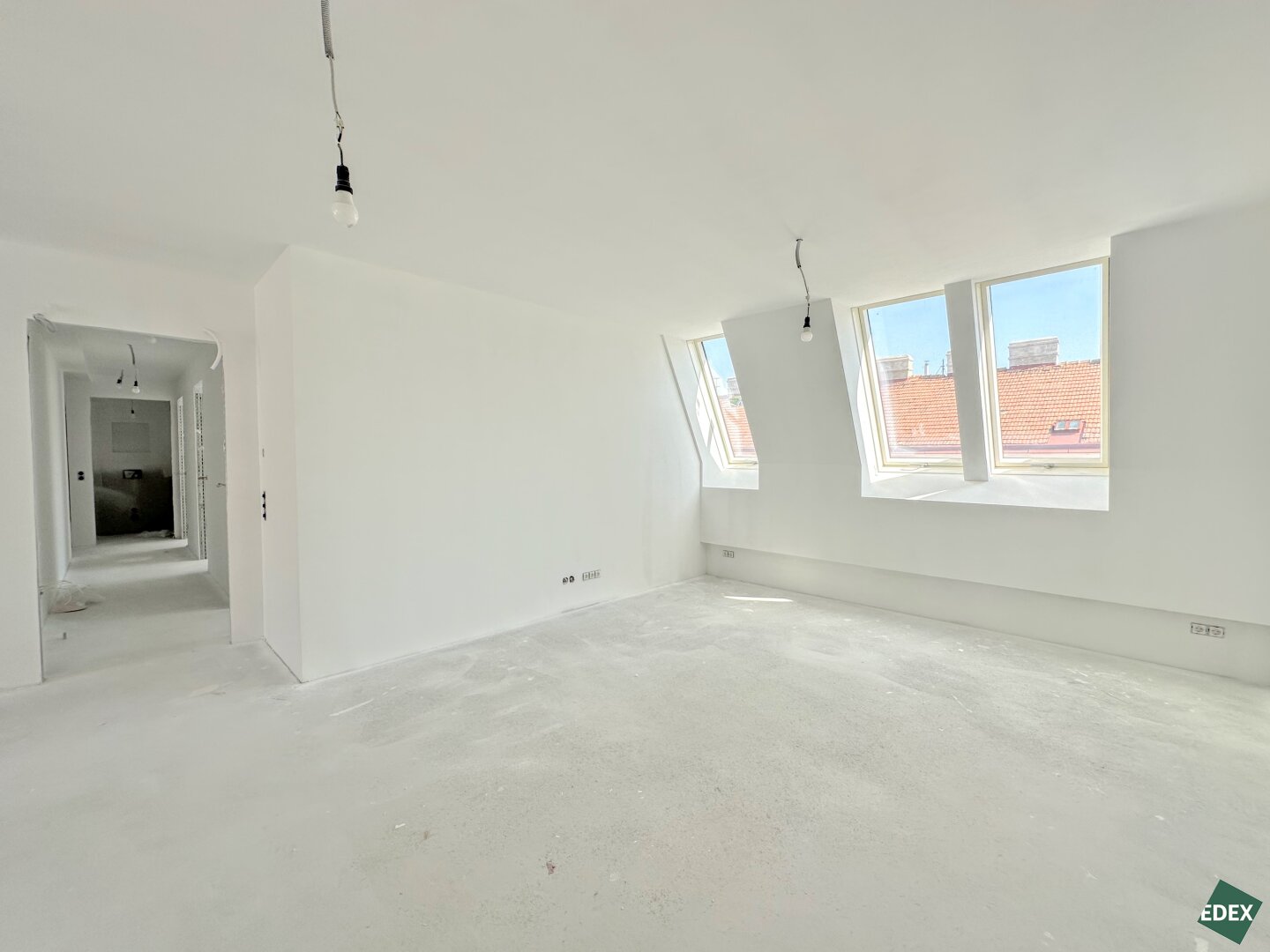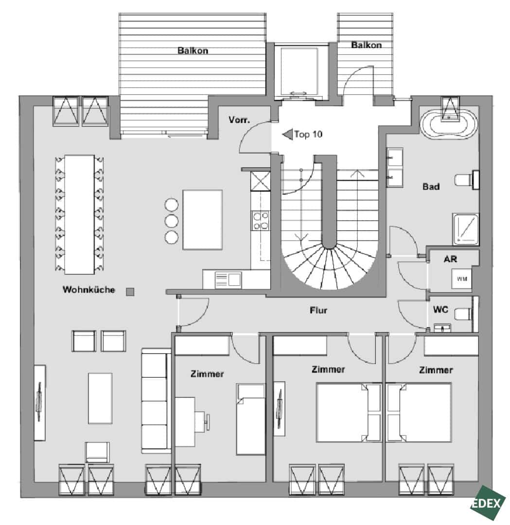 Die ca. 124 m² große 4-Zimmer-Wohnung befindet sich im neu ausgebauten Dachgeschoß. Die Wohnung verfügt über einen Vorraum, eine separate Toilette mit Handwaschbecken, ein modernes Badezimmer mit Doppelwaschbecken, Badewanne, Dusche und Toilette, einen Abstellraum mit Waschmaschinenanschluss, eine großzügige Wohnküche mit Anschlüssen für eine offene Küche sowie über drei Schlafzimmer. Zudem verfügt die Wohnung über zwei Balkone.