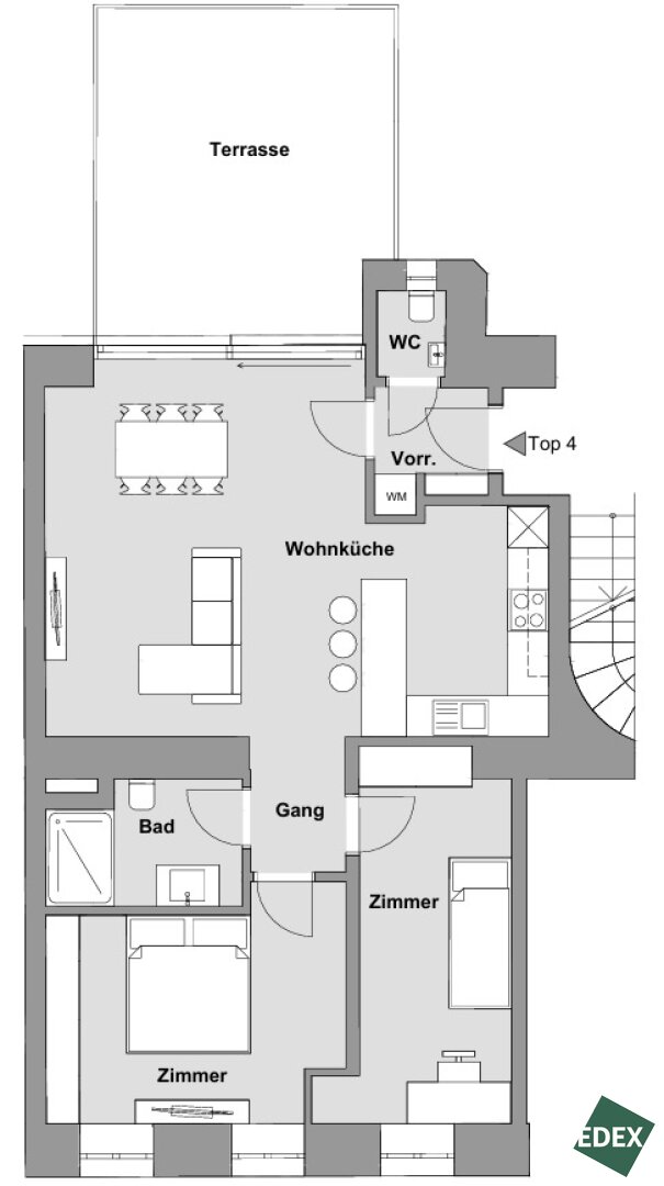 Der Vorraum bietet Platz für eine Garderobe und verfügt über eine praktische Nische mit Anschluss für eine Waschmaschine. Von hier aus gelangt man sowohl in die separate Gäste-Toilette mit Fenster und Handwaschbecken als auch in die großzügige Wohnküche. Diese öffnet sich zum Highlight der Wohnung – einer ca. 25 m² großen, süd- und hofseitig ausgerichteten Terrasse. Die Küchenanschlüsse werden individuell nach Käuferwunsch vorbereitet.