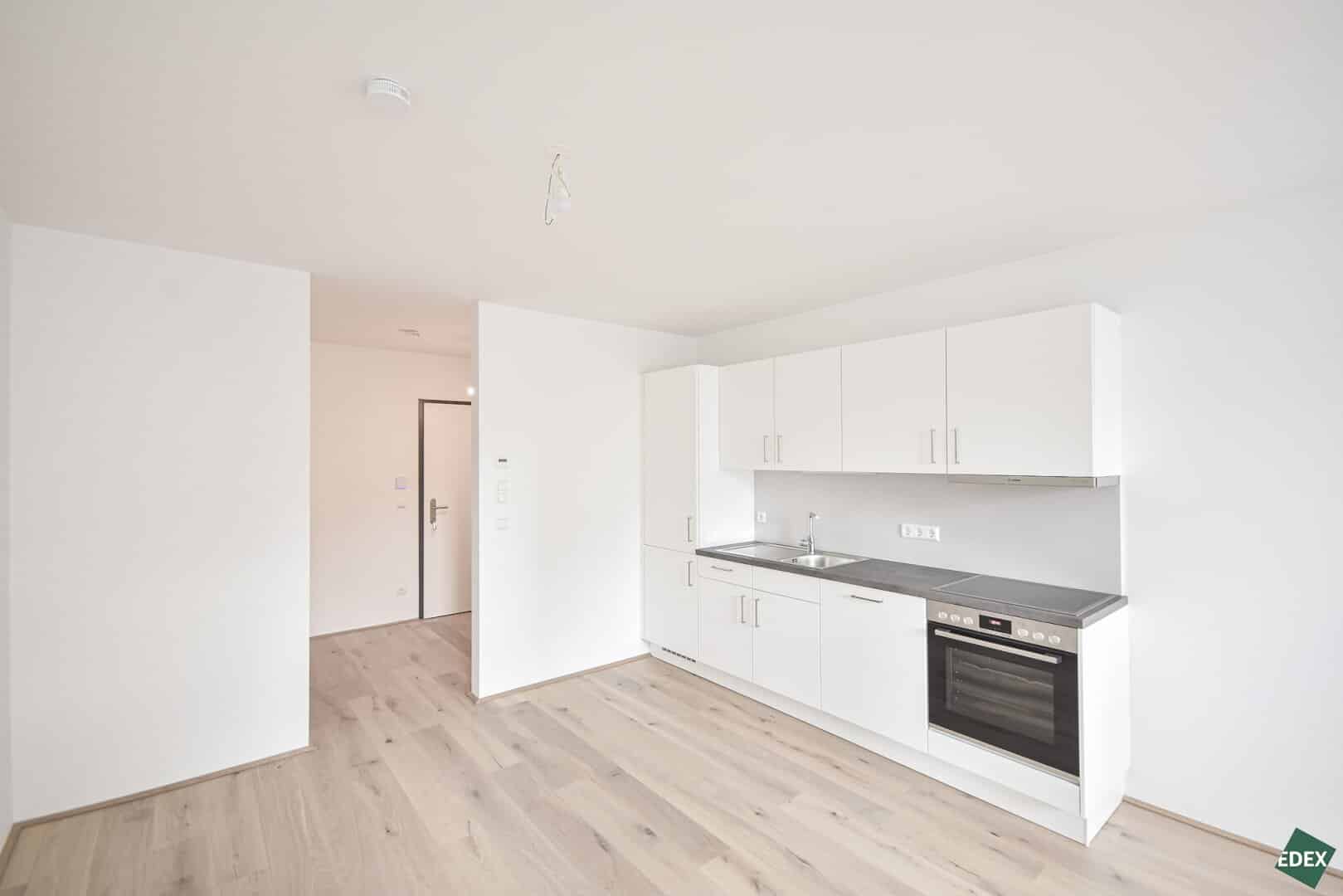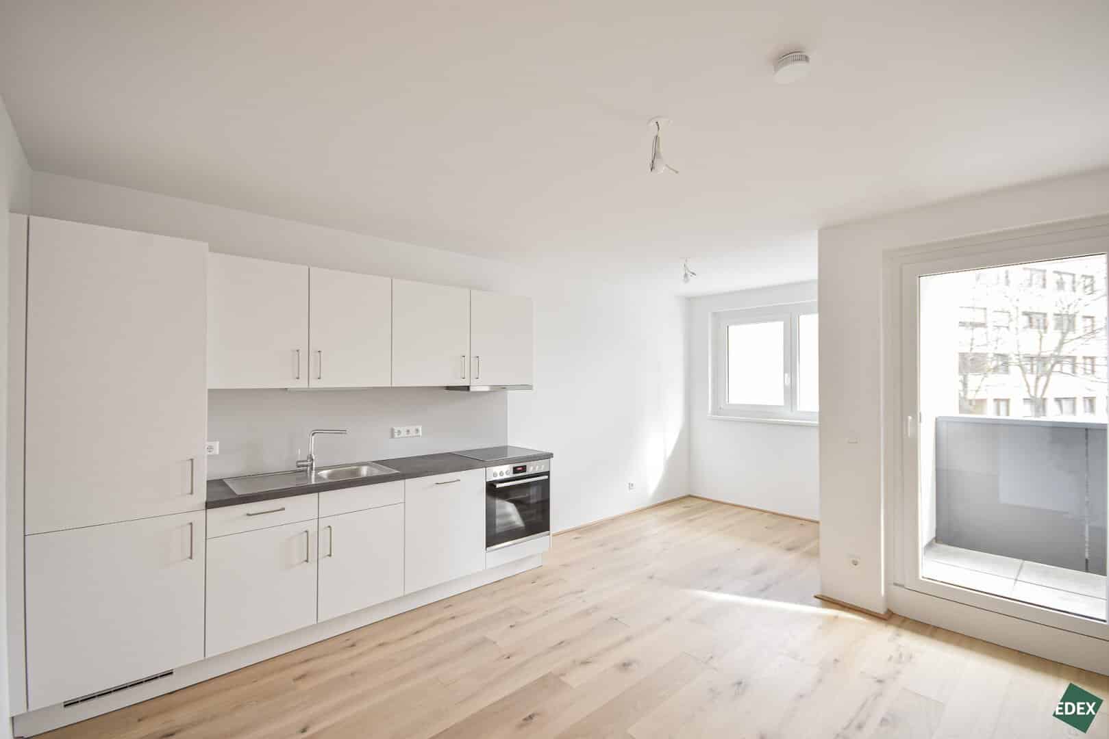Zur Vermietung gelangt eine schöne Zwei-Zimmer-Wohnung in urbaner Atmosphäre. Die lichtdurchflutete Wohnung liegt straßenseitig im 1. Obergeschoß und verfügt über einen Vorraum, ein modernes Badezimmer mit Waschmaschinenanschluss und einem WC, eine großzügige Wohnküche mit einer modernen, offenen Küche, ein Schlafzimmer, sowie eine Loggia. Der Außenbereich ist sowohl über das Wohnzimmer und das Schlafzimmer begehbar. Die Fenster sind mit einem außenliegenden Sonnenschutz versehen. Die Wohnräume sind mit hochwertigen Parkettböden und die Nassräume sind mit eleganten Fliesen ausgestattet. Im Haus befinden sich Kinderwagen- und Fahrradabstellräume, Paketboxen sowie eine Tiefgarage. Die Wohnung stehen ab sofort zur Verfügung und werden auf 5 Jahre befristet vermietet.