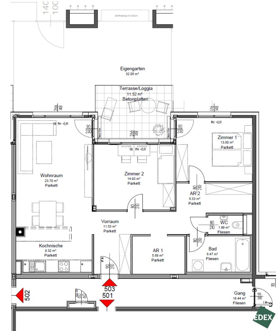 Der helle Wohnraum mit offener Kochnische schafft ein freundliches und einladendes Ambiente. Von hier aus gelangt man direkt auf die Terrasse/Loggia mit rund 11,52 m², die in den großzügigen Eigengarten mit ca. 32,05 m² führt – perfekt zum Entspannen im Freien.